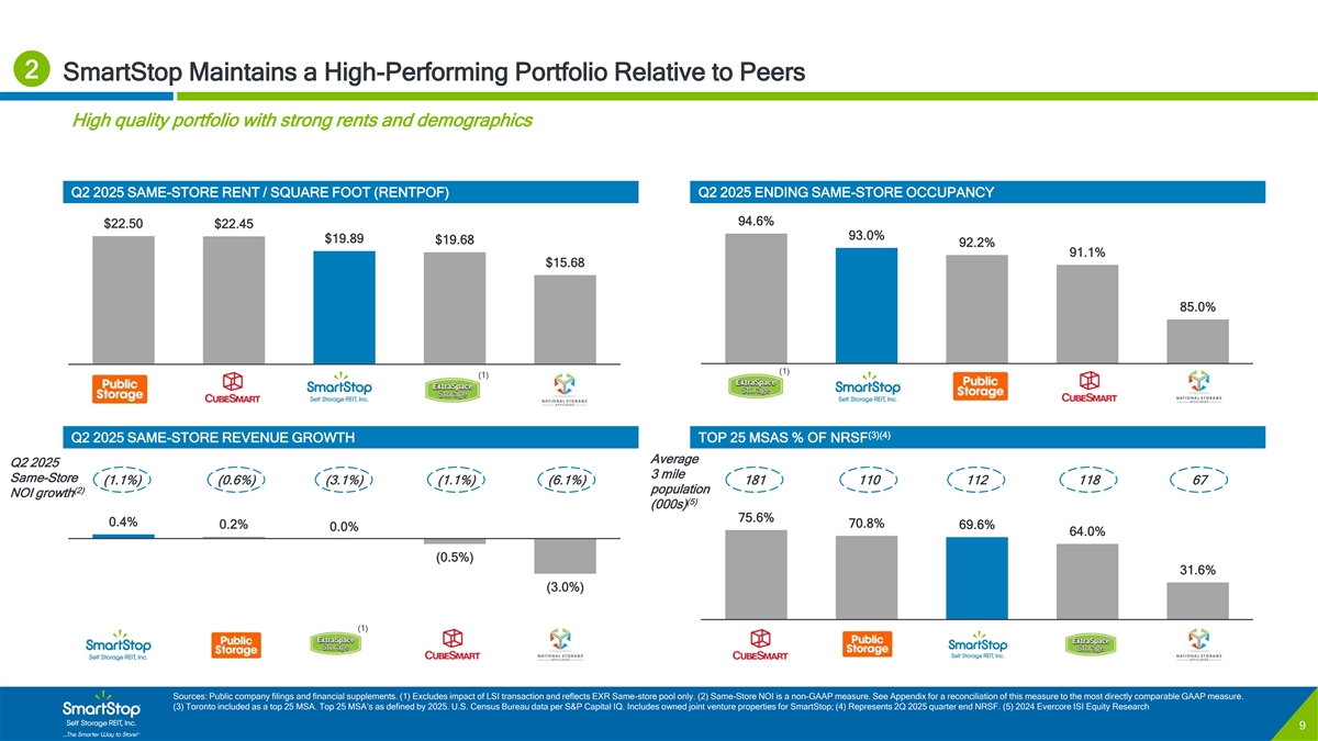 /Admin/ADVANCED GRAPHICS FILES/Cover and Template/2024/2024_01/4159141-001_Trevor McMillin_SmartStop_Cover & Template C O N F I D E N T I A L COLOR PALETTE Text 2 SmartStop Maintains a High-Performing Portfolio Relative to Peers 50 56 62 Title bar/Bullets High quality portfolio with strong rents and demographics 1 124 186 ACCENTS 1 126 124 211 1 186 254 Q2 2025 SAME-STORE RENT / SQUARE FOOT (RENTPOF) Q2 2025 ENDING SAME-STORE OCCUPANCY 127 212 188 253 2 94.6% $22.50 $22.45 3 129 93.0% $19.89 $19.68 92.2% 32 140 91.1% 56 168 3 $15.68 100 218 0 141 157 220 4 85.0% 226 255 166 219 166 219 5 166 219 (1) 1 126 (1) Hyperlink 124 211 186 254 127 212 Followed 188 253 Hyperlink 3 129 (3)(4) Q2 2025 SAME-STORE REVENUE GROWTH TOP 25 MSAS % OF NRSF TABLE Average Q2 2025 50 3 mile Same-Store 56 (1.1%) (0.6%) (3.1%) (1.1%) (6.1%) 181 110 112 118 67 Lines (2) population 62 NOI growth (5) (000s) 1 75.6% 0.4% 70.8% 0.2% 124 69.6% Highlights 0.0% 64.0% 186 (0.5%) 31.6% (3.0%) (1) Sources: Public company filings and financial supplements. (1) Excludes impact of LSI transaction and reflects EXR Same-store pool only. (2) Same-Store NOI is a non-GAAP measure. See Appendix for a reconciliation of this measure to the most directly comparable GAAP measure. (3) Toronto included as a top 25 MSA. Top 25 MSA’s as defined by 2025. U.S. Census Bureau data per S&P Capital IQ. Includes owned joint venture properties for SmartStop; (4) Represents 2Q 2025 quarter end NRSF. (5) 2024 Evercore ISI Equity Research 9