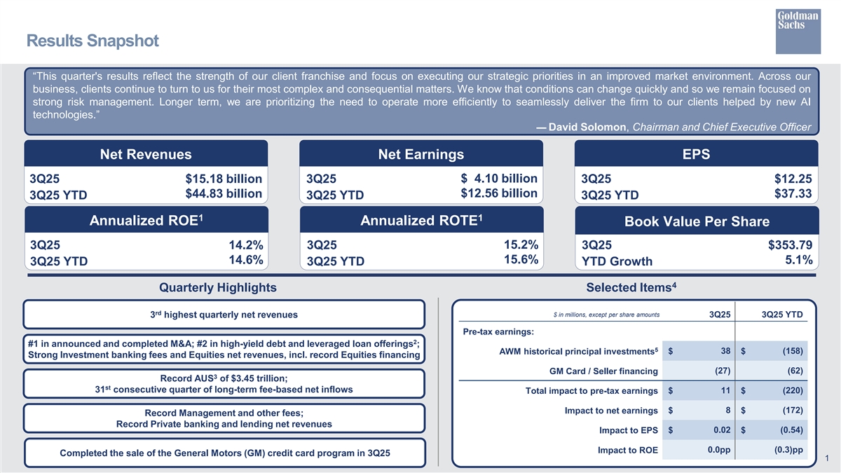 2025年10月14日、ニューヨーク発 - ゴールドマン・サックス・グループ(NYSE:GS)は本日、2025年9月30日に終了した第3四半期の純収益が151億8,000万ドル、純利益が41億ドルであったと発表しました。2025 年 1~9 月期の純収入は 448 億 3,000 万ドル、純利益は 125 億 6,000 万ドルでした。