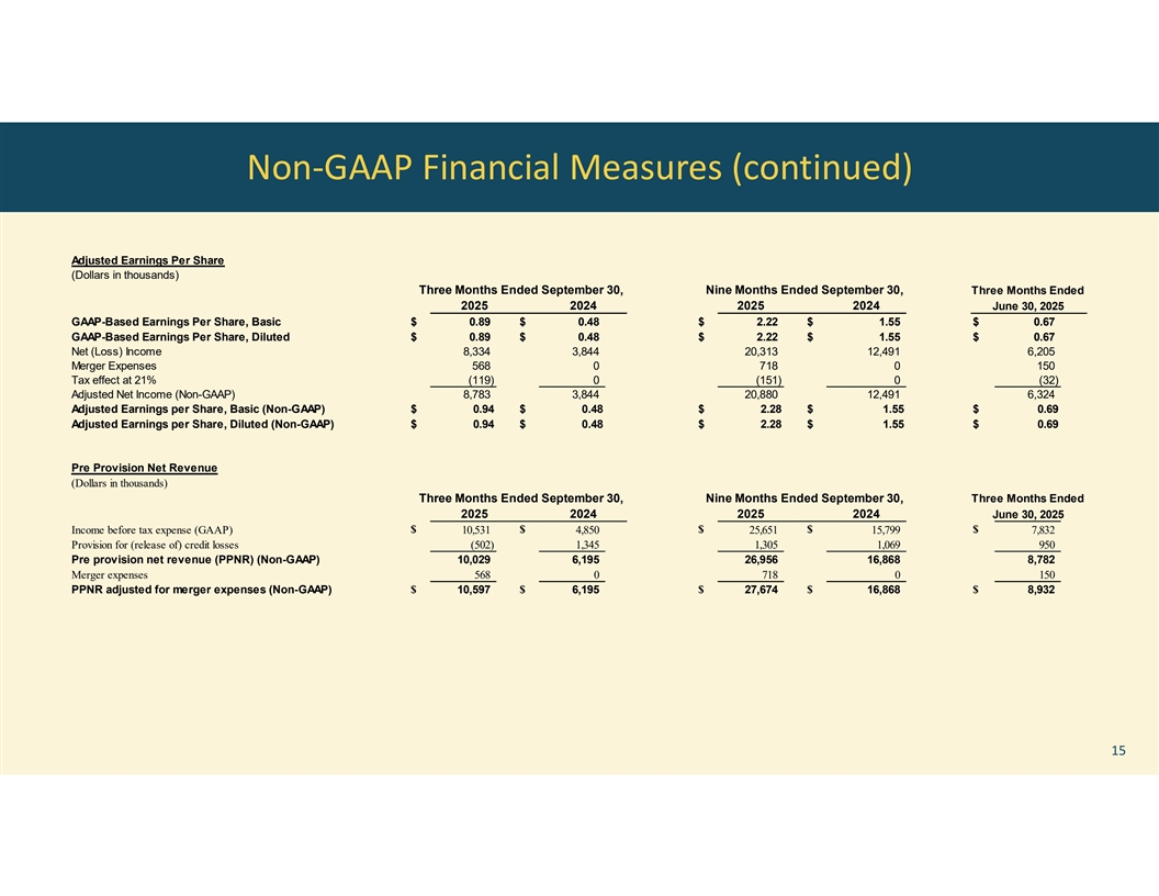 Non-GAAP Financial Measures (continued) Adjusted Earnings Per Share (Dollars in thousands) Three Months Ended September 30, Nine Months Ended September 30, Three Months Ended 2025 2024 2025 2024 June 30, 2025 GAAP-Based Earnings Per Share, Basic $ 0.89 $ 0.48 $ 2.22 $ 1.55 $ 0.67 GAAP-Based Earnings Per Share, Diluted $ 0.89 $ 0.48 $ 2.22 $ 1.55 $ 0.67 Net (Loss) Income 8,334 3,844 20,313 12,491 6,205 Merger Expenses 568 0 718 0 150 Tax effect at 21% (119) 0 (151) 0 (32) Adjusted Net Income (Non-GAAP) 8,783 3,844 20,880 12,491 6,324 Adjusted Earnings per Share, Basic (Non-GAAP) $ 0.94 $ 0.48 $ 2.28 $ 1.55 $ 0.69 Adjusted Earnings per Share, Diluted (Non-GAAP) $ 0.94 $ 0.48 $ 2.28 $ 1.55 $ 0.69 Pre Provision Net Revenue (Dollars in thousands) Three Months Ended September 30, Nine Months Ended September 30, Three Months Ended 2025 2024 2025 2024 June 30, 2025 $ $ $ $ $ Income before tax expense (GAAP) 10,531 4,850 25,651 15,799 7,832 Provision for (release of) credit losses (502) 1,345 1,305 1,069 950 Pre provision net revenue (PPNR) (Non-GAAP) 10,029 6,195 26,956 16,868 8,782 Merger expenses 568 0 718 0 150 PPNR adjusted for merger expenses (Non-GAAP) $ 10,597 $ 6,195 $ 27,674 $ 16,868 $ 8,932 15