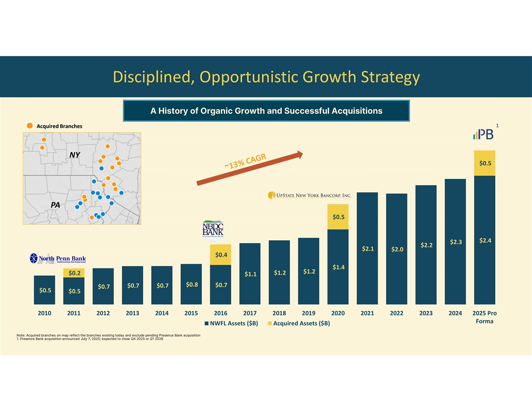 Disciplined, Opportunistic Growth Strategy A History of Organic Growth and Successful Acquisitions 1 Acquired Branches NY $0.5 PA $0.5 $2.4 $2.3 $2.2 $2.1 $2.0 $0.4 $1.4 $1.2 $1.2 $0.2 $1.1 $0.8 $0.7 $0.7 $0.7 $0.7 $0.5 $0.5 2010 2011 2012 2013 2014 2015 2016 2017 2018 2019 2020 2021 2022 2023 2024 2025 Pro Forma NWFL Assets ($B) Acquired Assets ($B) Note: Acquired branches on map reflect the branches existing today and exclude pending Presence Bank acquisition 1. Presence Bank acquisition announced July 7, 2025; expected to close Q4 2025 or Q1 2026