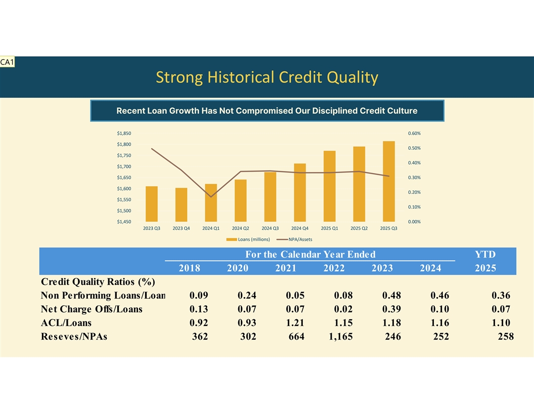 CA1 Strong Historical Credit Quality Recent Loan Growth Has Not Compromised Our Disciplined Credit Culture $1,850 0.60% $1,800 0.50% $1,750 0.40% $1,700 $1,650 0.30% $1,600 0.20% $1,550 0.10% $1,500 $1,450 0.00% 2023 Q3 2023 Q4 2024 Q1 2024 Q2 2024 Q3 2024 Q4 2025 Q1 2025 Q2 2025 Q3 Loans (millions) NPA/Assets For the Calendar Year Ended YTD 2018 2020 2021 2022 2023 2024 2025 Credit Quality Ratios (%) Non Performing Loans/Loans 0.09 0 .24 0 .05 0 .08 0 .48 0 .46 0.36 Net Charge Offs/Loans 0.13 0 .07 0 .07 0 .02 0 .39 0 .10 0.07 ACL/Loans 0.92 0 .93 1 .21 1 .15 1 .18 1 .16 1.10 Reseves/NPAs 3 62 302 6 64 1 ,165 246 2 52 258