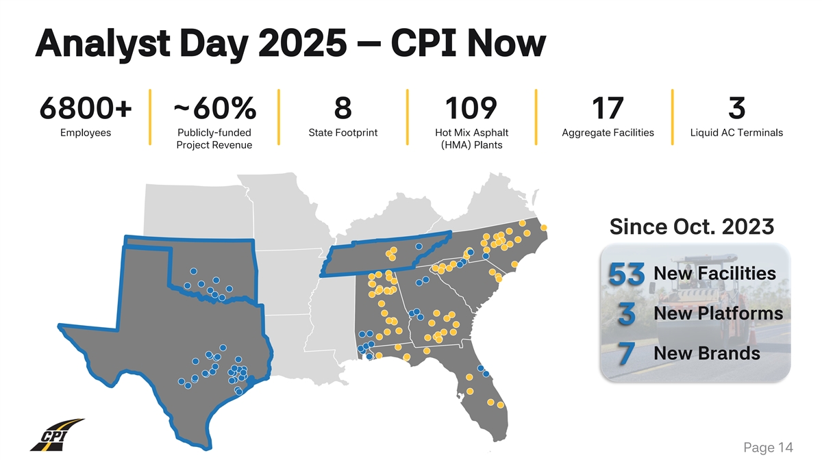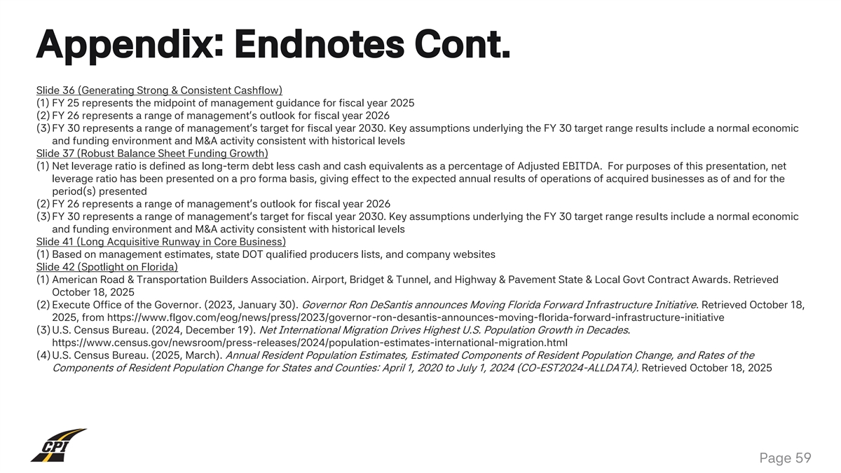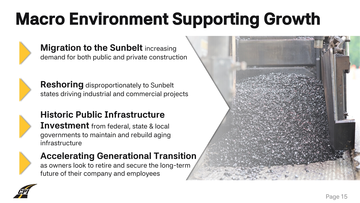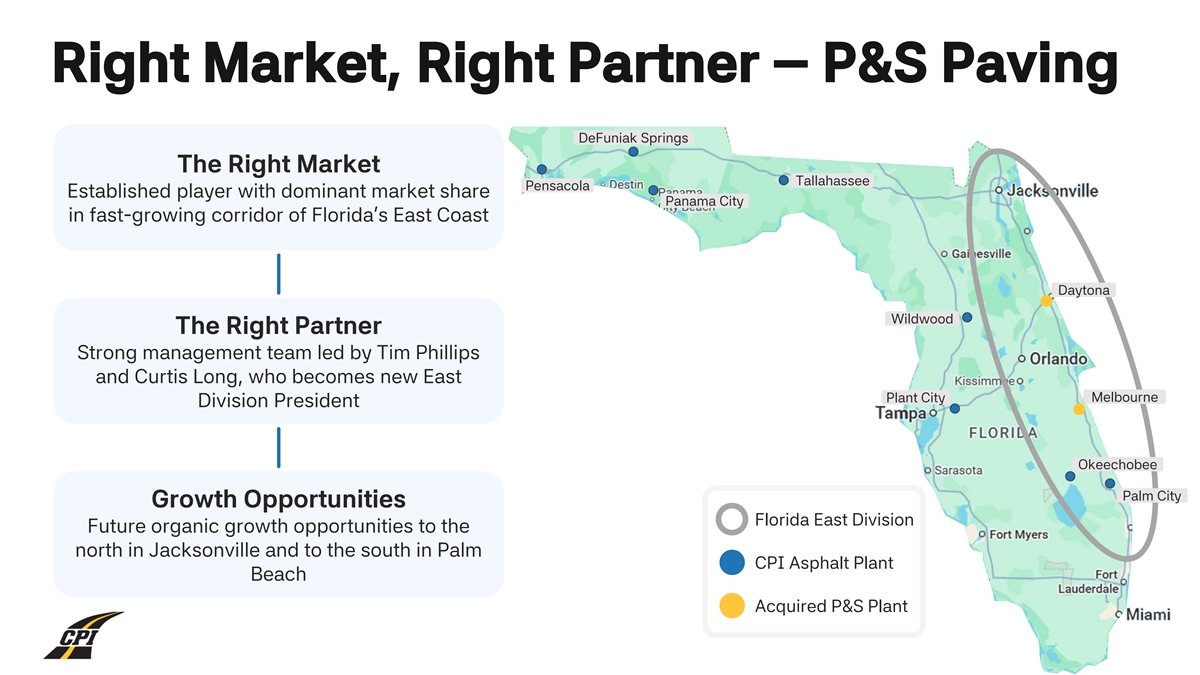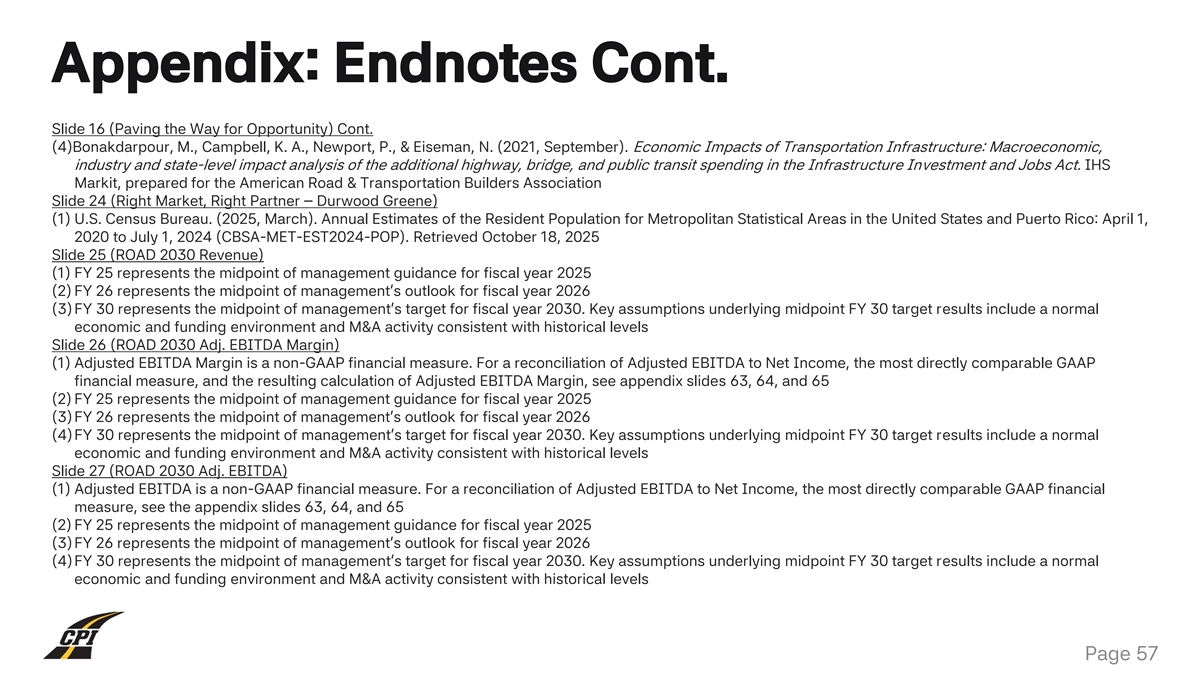 スミスは次のようにコメントした。「わが社の系列会社が戦略的成長計画を有機的に、あるいは買収を通じて実行し続けるなかで、わが社は引き続き、わが社の市場における事業業績と戦略的入札の強化、建設資材とサービスの垂直統合機会の拡大、組織全体の企業コストの縮小による利幅の拡大に注力していく。当社の事業は、サンベルト地帯における輸送資金調達プログラムや健全な商業市場によってもたらされる機会から引き続き恩恵を受けると確信しています。当社の2026年度の見通しは、再び力強い成長が見込まれる年であり、すべてのステークホルダーのために価値を築き続けるCPIの将来について強気である。"