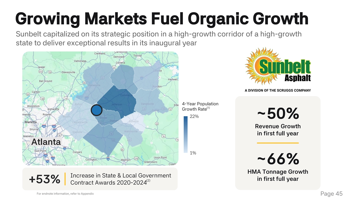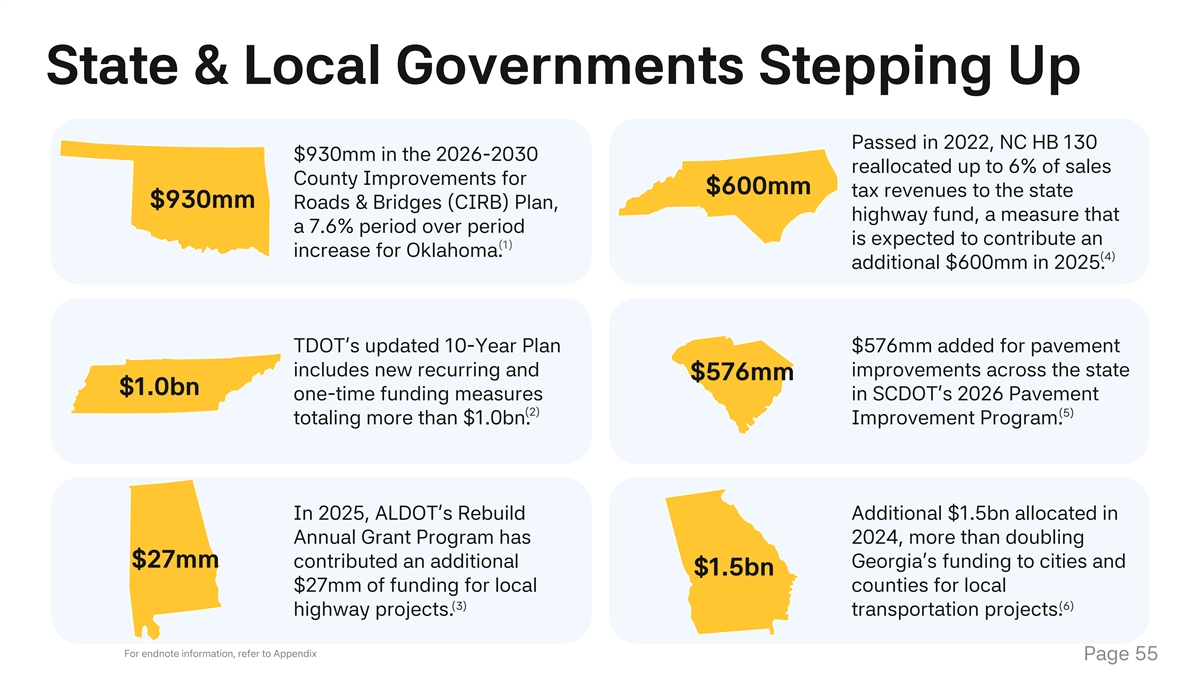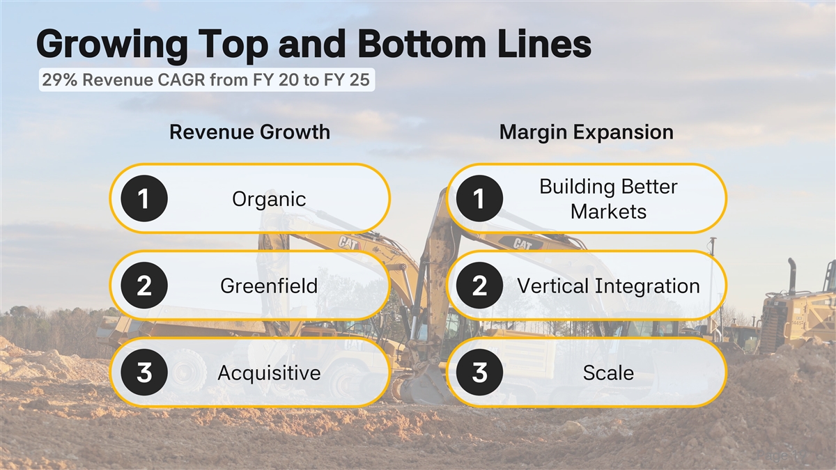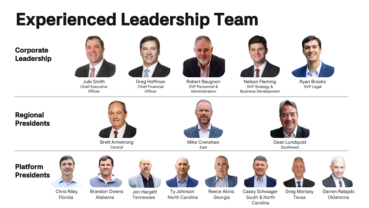 当社の社長兼最高経営責任者であるフレッド・J・(ジュール)・スミス3世は、「本日、2025年度の暫定決算を発表します。2025年度は当社にとってダイナミックな成長の年となり、2つの州に新規参入するとともに、5つの戦略的買収を行い、既存事業の売上高は前年度比8.4%増となりました。2026年度に向けては、サンベルト地域の継続的な経済成長、良好な人口動向、十分な資金が投入された輸送プログラム、買収および既存事業のさらなる成長機会など、強力な指標を見込んでいます。明日、アナリスト・デーのイベントに参加される方々と、当社の戦略的イニシアチブ、成長の優先事項、事業見通しについて、直接、または当社ウェブサイトのウェブキャスト・リンクを通じてお話しできることを楽しみにしています。"