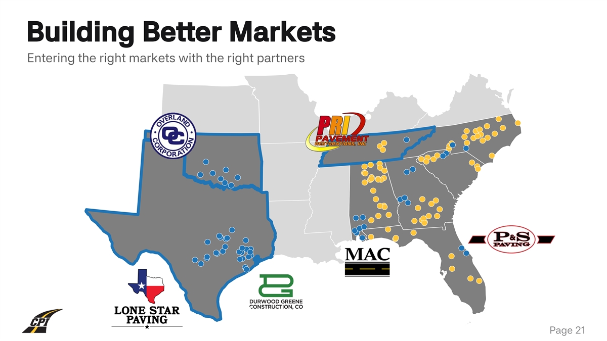 コンストラクション・パートナーズ社は、アラバマ州、フロリダ州、ジョージア州、ノースカロライナ州、オクラホマ州、サウスカロライナ州、テネシー州、テキサス州のサンベルト地域のローカル市場で事業を展開する垂直統合型の土木インフラ企業である。ホットミックスアスファルト工場、骨材施設、液体アスファルトターミナルに支えられ、地上インフラの建設、補修、メンテナンスに注力している。公的資金によるプロジェクトが事業の大半を占め、地方道や州道、州間高速道路、空港滑走路、橋梁などが含まれる。同社はまた、オフィスや工業団地、ショッピングセンター、地元企業、住宅開発の舗装や現場工事などの民間プロジェクトも手がけている。詳しくはwww.constructionpartners.net。
