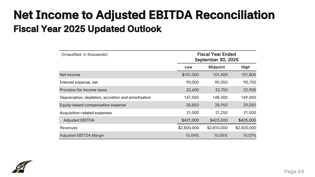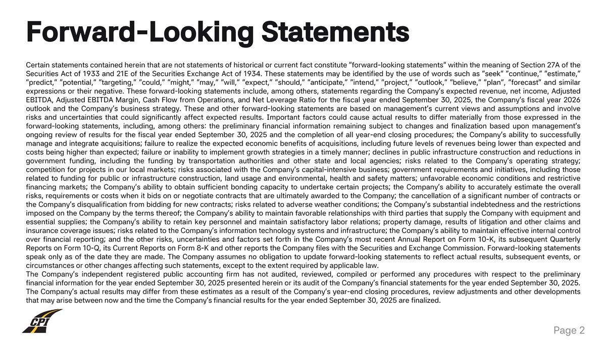 ここに記載されている記述のうち、歴史的事実または現在の事実に関する記述ではないものは、1933年証券法第27条Aおよび1934年証券取引法第21条Eに定義される「将来の見通しに関する記述」に該当します。これらの記述は、「求める」、「継続する」、「推定する」、「予測する」、「可能性がある」、「目標とする」、「可能性がある」、「かもしれない」、「する予定である」、「期待する」、「はずである」、「予想する」、「意図する」、「計画する」、「見通し」、「信じる」、「計画する」などの語句の使用またはその否定により特定される場合があります。これらの将来の見通しに関する記述には、特に、2025年9月30日に終了する会計年度における当社の予想収益、純利益、調整後純利益、調整後EBITDA、調整後EBITDAマージン、2026会計年度の見通し、および当社の事業戦略に関する記述が含まれます。これらおよびその他の将来の見通しに関する記述は、経営陣の現在の見解および仮定に基づくものであり、予想される結果に重大な影響を及ぼす可能性のあるリスクおよび不確実性を含んでいます。実際の業績は、様々な重要な要素により、これら業績見通しとは大きく異なる結果となりうることをご承知おきください:2025年9月30日に終了する会計年度の業績に関する経営陣による継続的な検討およびすべての年度末決算手続きの完了に基づき、暫定的な財務情報が変更および確定される可能性があること、買収を成功裏に管理および統合する当社の能力、将来の収益水準が予想より低く、費用が予想より高いなど、買収により期待される経済的便益を実現できないこと、成長戦略を適時に実施できないこと、または実施できないこと;公共インフラ建設の減少、交通当局およびその他の州・地方機関による資金調達を含む政府資金の減少、当社の事業戦略に関連するリスク、当社の地元市場におけるプロジェクト獲得競争、当社の資本集約型事業に関連するリスク、公共・インフラ建設資金、土地利用、環境・衛生・安全に関する事項を含む政府の要求事項およびイニシアチブ、好ましくない経済状況および制限的な資金調達市場、特定のプロジェクトを実施するために十分な保税能力を獲得する当社の能力;当社が最終的に受注する契約の入札時または交渉時に、全体的なリスク、要件、またはコストを正確に見積もる能力、相当数の契約の取り消し、または新規契約の入札資格を失うこと、悪天候に関連するリスク、当社の多額の負債およびその条件によって当社に課される制約、当社に設備や必要不可欠な物資を供給する第三者との良好な関係を維持する能力;当社の重要な人材を維持し、良好な労使関係を維持する能力、物的損害、訴訟結果、その他のクレームおよび保険適用に関する問題、当社の情報技術システムおよびインフラに関連するリスク、財務報告に対する効果的な内部統制を維持する能力、および当社の最新の年次報告書(Form 10-K)、その後の四半期報告書(Form 10-Q)、最新報告書(Form 8-K)、および当社が証券取引委員会に提出するその他の報告書に記載されているその他のリスク、不確実性および要因。