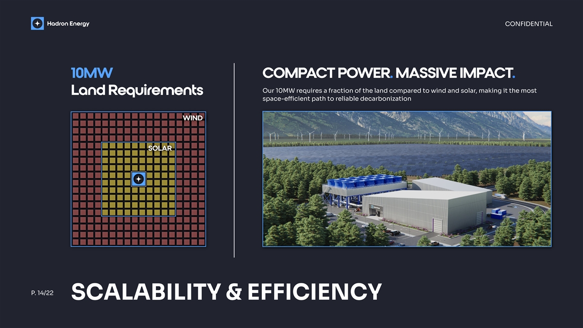 CONFIDENTIAL 10MW COMPACT POWER. MASSIVE IMPACT. Our 10MW requires a fraction of the land compared to wind and solar, making it the most Land Requirements space-efficient path to reliable decarbonization WIND SOLAR P. 14/22 SCALABILITY & EFFICIENCY