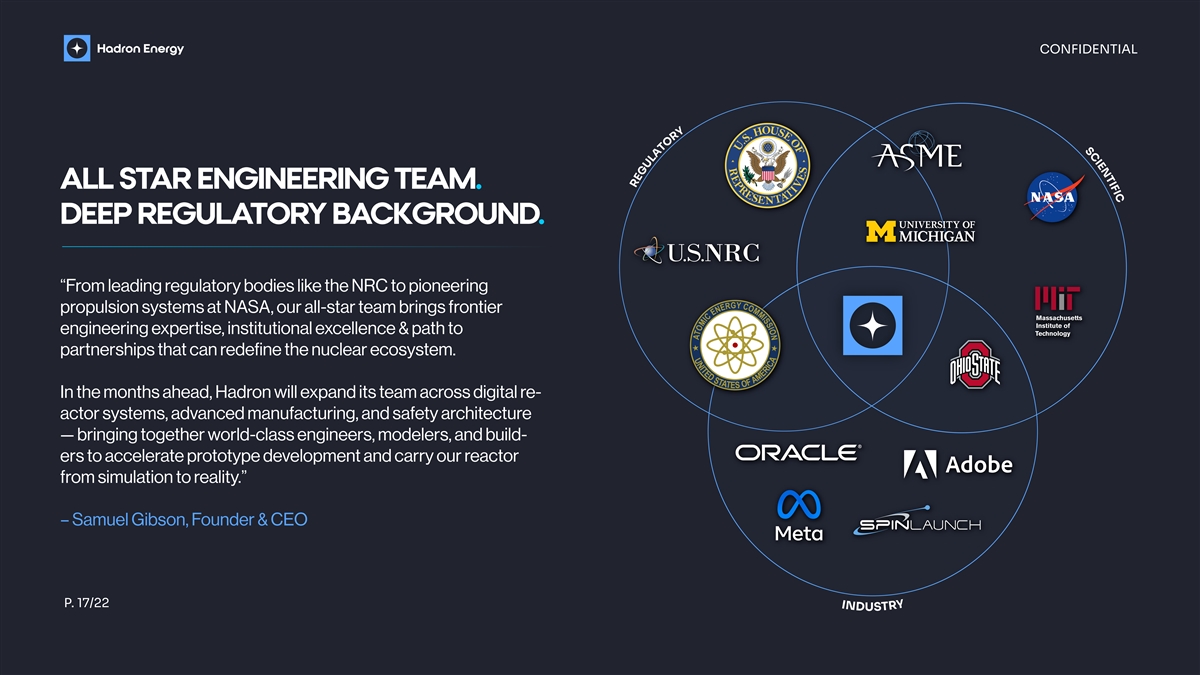 I N D U CONFIDENTIAL ALL STAR ENGINEERING TEAM. DEEP REGULATORY BACKGROUND. “From leading regulatory bodies like the NRC to pioneering propulsion systems at NASA, our all-star team brings frontier engineering expertise, institutional excellence & path to partnerships that can redefine the nuclear ecosystem. In the months ahead, Hadron will expand its team across digital re- actor systems, advanced manufacturing, and safety architecture — bringing together world-class engineers, modelers, and build- ers to accelerate prototype development and carry our reactor from simulation to reality.” – Samuel Gibson, Founder & CEO P. 17/22 S T R Y
