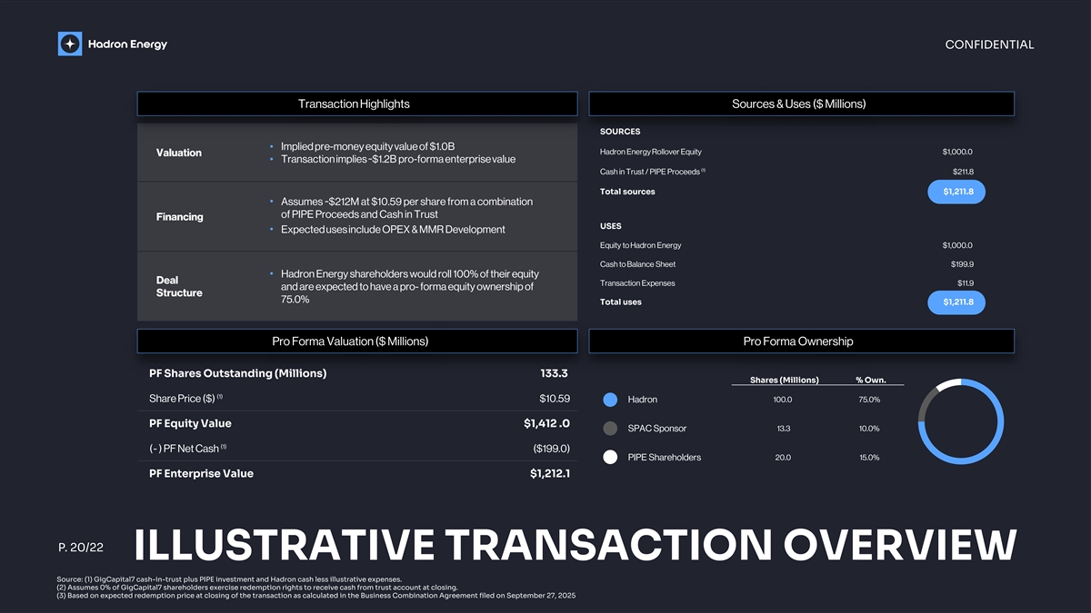 CONFIDENTIAL Transaction Highlights Sources & Uses ($ Millions) SOURCES • Implied pre-money equity value of $1.0B Hadron Energy Rollover Equity $1,000.0 Valuation • Transaction implies ~$1.2B pro-forma enterprise value (1) Cash in Trust / PIPE Proceeds $211.8 Total sources $1,211.8 • Assumes ~$212M at $10.59 per share from a combination of PIPE Proceeds and Cash in Trust Financing USES • Expected uses include OPEX & MMR Development Equity to Hadron Energy $1,000.0 Cash to Balance Sheet $199.9 • Hadron Energy shareholders would roll 100% of their equity Deal Transaction Expenses $11.9 and are expected to have a pro- forma equity ownership of Structure 75.0% Total uses $1,211.8 Pro Forma Valuation ($ Millions) Pro Forma Ownership PF Shares Outstanding (Millions) 133.3 Shares (Millions) % Own. (1) Share Price ($) $10.59 100.0 75.0% Hadron PF Equity Value $1,412 .0 13.3 10.0% SPAC Sponsor (1) (- ) PF Net Cash ($199.0) 20.0 15.0% PIPE Shareholders PF Enterprise Value $1,212.1 P. 20/22 ILLUSTRATIVE TRANSACTION OVERVIEW Source: (1) GigCapital7 cash-in-trust plus PIPE investment and Hadron cash less illustrative expenses. (2) Assumes 0% of GigCapital7 shareholders exercise redemption rights to receive cash from trust account at closing. (3) Based on expected redemption price at closing of the transaction as calculated in the Business Combination Agreement filed on September 27, 2025