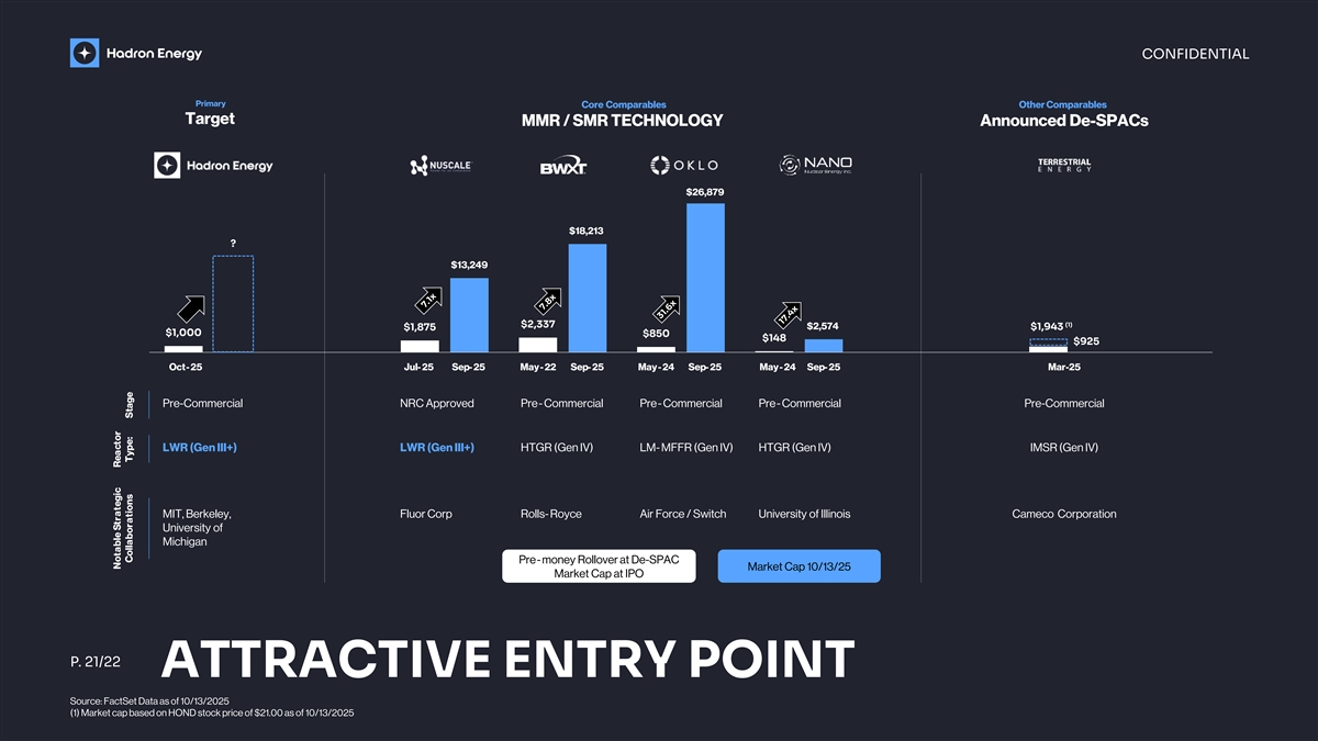 CONFIDENTIAL Primary Core Comparables Other Comparables Target MMR / SMR TECHNOLOGY Announced De-SPACs $26,879 $18,213 ? $13,249 (1) $2,337 $2,574 $1,875 $1,943 $1,000 $850 $148 $925 Oct- 25 Jul- 25 Sep- 25 May - 22 Sep- 25 May - 24 Sep- 25 May - 24 Sep- 25 Mar-25 Pre-Commercial NRC Approved Pre - Commercial Pre - Commercial Pre - Commercial Pre-Commercial LWR (Gen III+) LWR (Gen III+) HTGR (Gen IV) LM- MFFR (Gen IV) HTGR (Gen IV) IMSR (Gen IV) MIT, Berkeley, Fluor Corp Rolls- Royce Air Force / Switch University of Illinois Cameco Corporation University of Michigan Pre- money Rollover at De-SPAC Market Cap 10/13/25 Market Cap at IPO P. 21/22 ATTRACTIVE ENTRY POINT Source: FactSet Data as of 10/13/2025 (1) Market cap based on HOND stock price of $21.00 as of 10/13/2025 7.1x 7.8x 31.6x 17.4x Notable Strategic Reactor Collaborations Type: Stage
