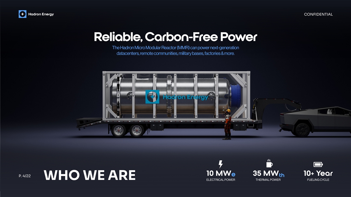 CONFIDENTIAL Reliable, Carbon-Free Power The Hadron Micro Modular Reactor (MMR) can power next-generation datacenters, remote communities, military bases, factories & more. 10 MW 35 MW 10+ Year e th P. 4/22 WHO WE ARE ELECTRICAL POWER THERMAL POWER FUELING CYCLE