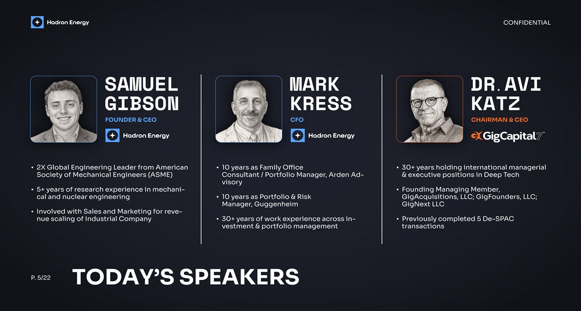 CONFIDENTIAL Forward-Looking Statements This presentation contains certain “forward-looking statements” within the meaning of the “safe harbor” provisions of the United States Private Securities Litigation Reform Act of 1996. Hadron’s, GigCapital7’s and the Post-Closing Company’s actual results may differ from their expectations, estimates and projections, and consequently, you should not rely on these forward-looking statements as predictive of future events. Forward-looking statements can sometimes be identified by words such as “may,” “could,” “would,” “should,” “expect,” “possible,” “potential,” “goal,” “opportunity,” “project,” “believe,” “future”, “designed,” “forecast,” “target,” “will,” “anticipate” and, in each case, similar words and expressions, or their negative variations, and terminology that predict or indicate future events. These forward-looking statements include all matters that are not historical facts and include, without limitation, estimates, forecasts or projections regarding Hadron’s future manufacturing capacity and plant performance; market opportunity and market share; estimates and projections of adjacent energy sector opportunities; Hadron’s projected commercialization costs and timeline; Hadron’s ability to demonstrate scientific and engineering feasibility of its technologies; Hadron’s ability to attract, retain and expand its future customer base; Hadron’s ability to timely and effectively meet construction and development timelines and scale its production and manufacturing processes; Hadron’s ability to develop products and services and bring them to market in a timely manner; Hadron’s ability to compete successfully with energy products and solutions offered by other companies; Hadron’s expectations concerning relationships with strategic partners, suppliers, governments, regulatory bodies and other third parties; Hadron’s ability to maintain, protect, and enhance its intellectual property; future ventures or investments in companies or products, services, or technologies; Hadron’s expectations regarding regulatory framework development; the potential for and timing of receipt of licenses and permits for current and future operations, including licenses to operate nuclear facilities from the U.S. Nuclear Regulatory Commission; the success of proposed projects for which Hadron’s products would provide power, which is outside of Hadron’s control; the safety profile of Hadron’s technology; the execution and success of any definitive agreements related to partnerships and collaborations between Hadron and third parties; Hadron’s expectations with respect to future performance; the consummation of the proposed business combination; and the potential benefits of the proposed business combination and expectations related to its terms and timing. These statements are based on management’s expectations, assumptions, estimates, projections and beliefs as of the date of this presentation, whether or not identified in this presentation, and are not predictions of actual performance. These forward- looking statements are provided for illustrative purposes only and are not intended to serve as and must not be relied on by any investor as a guarantee, an assurance, a prediction or a definitive statement of fact or probability. These statements are subject to a number of factors that involve known and unknown risks, delays, uncertainties and other factors not under the control of Hadron or GigCapital7 that may cause actual results, performance or achievements of Hadron, GigCapital7 or the Post-Closing Company to be materially different from the future results, performance or other expectations expressed or implied by these forward-looking statements. Such risks and uncertainties include risks related to the future performance of Hadron; the risk that Hadron is pursing an emerging market; regulatory uncertainties and possible changes to applicable laws or regulations; the potential need for financing for future operations; financial, political and legal conditions; the inability of the parties to successfully or timely consummate the proposed business combination, including the risk that the approval of GigCapital7’s shareholders is not obtained; the outcome of any government or regulatory proceedings, investigations or inquiries; market volatility and its potential to impact Hadron’s ability to meet its financial obligations; increased competition in the energy industry; limited supply of materials and supply chain disruptions; and other risks and uncertainties set forth in the sections entitled “Risk Factors” and Cautionary Note Regarding Forward-looking Statements in GigCapital7’s 2024 Form 10-K and subsequently filed Quarterly Reports on Form 10-Q, as such factors may be updated from time to time in GigCapital7’s filings with the SEC, the registration statement on FormS4 and the proxy statement/prospectus contained therein. Other unknown or unpredictable factors or underlying assumptions subsequently proving to be incorrect could cause actual results to differ materially from those in the forward-looking statements. Although Hadron and GigCapital7 believe that the expectations reflected in the forward-looking statements are reasonable, Hadron cannot guarantee future results, level of activity, performance, or achievements. You should not place undue reliance on these forward-looking statements. All information provided in this presentation is as of today’s date, unless otherwise stated, and Hadron and GigCapital7 undertake no duty to update such information, except as required under applicable law. Market Data and Statistics This presentation includes statistical and other industry and market data that Hadron obtained from industry publications and research, surveys, studies and other similar third-party sources, as well as Hadron’s estima