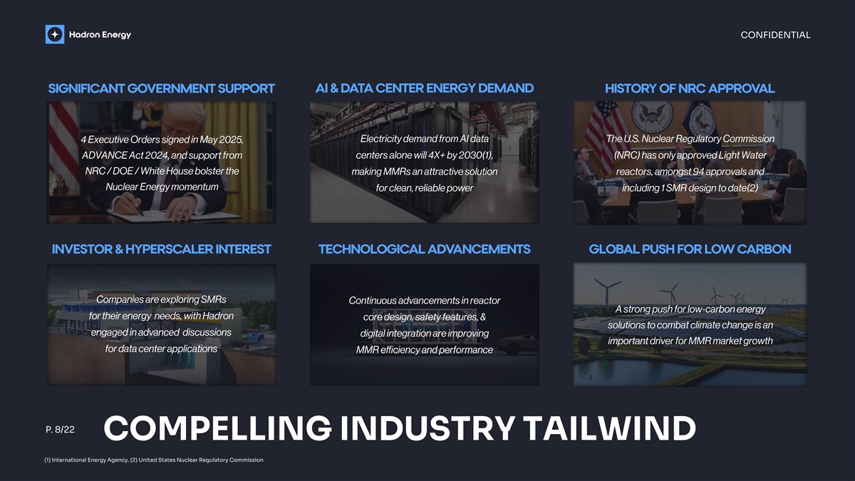 CONFIDENTIAL SIGNIFICANT GOVERNMENT SUPPORT AI & DATA CENTER ENERGY DEMAND HISTORY OF NRC APPROVAL Electricity demand from AI data The U.S. Nuclear Regulatory Commission 4 Executive Orders signed in May 2025, ADVANCE Act 2024, and support from centers alone will 4X+ by 2030(1), (NRC) has only approved Light Water NRC / DOE / White House bolster the making MMRs an attractive solution reactors, amongst 94 approvals and Nuclear Energy momentum for clean, reliable power including 1 SMR design to date(2) INVESTOR & HYPERSCALER INTEREST TECHNOLOGICAL ADVANCEMENTS GLOBAL PUSH FOR LOW CARBON Companies are exploring SMRs Continuous advancements in reactor A strong push for low-carbon energy for their energy needs, with Hadron core design, safety features, & solutions to combat climate change is an engaged in advanced discussions digital integration are improving important driver for MMR market growth for data center applications MMR efficiency and performance P. 8/22 COMPELLING INDUSTRY TAILWIND (1) International Energy Agency. (2) United States Nuclear Regulatory Commission