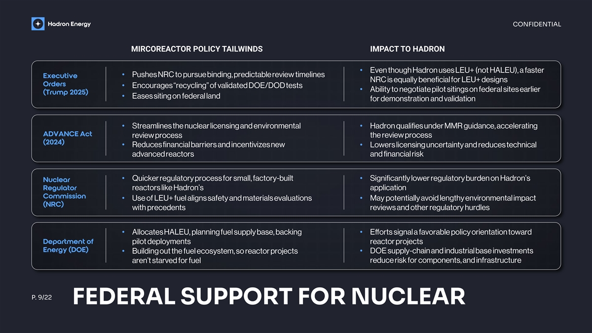 CONFIDENTIAL MIRCOREACTOR POLICY TAILWINDS IMPACT TO HADRON • Even though Hadron uses LEU+ (not HALEU), a faster • Pushes NRC to pursue binding, predictable review timelines Executive NRC is equally beneficial for LEU+ designs Orders • Encourages “recycling” of validated DOE/DOD tests • Ability to negotiate pilot sitings on federal sites earlier (Trump 2025) • Eases siting on federal land for demonstration and validation • Streamlines the nuclear licensing and environmental • Hadron qualifies under MMR guidance, accelerating ADVANCE Act the review process review process (2024) • Reduces financial barriers and incentivizes new • Lowers licensing uncertainty and reduces technical and financial risk advanced reactors • Quicker regulatory process for small, factory-built • Significantly lower regulatory burden on Hadron’s Nuclear Regulator reactors like Hadron’s application Commission • May potentially avoid lengthy environmental impact • Use of LEU+ fuel aligns safety and materials evaluations (NRC) with precedents reviews and other regulatory hurdles • Allocates HALEU, planning fuel supply base, backing • Efforts signal a favorable policy orientation toward Department of pilot deployments reactor projects Energy (DOE) • DOE supply-chain and industrial base investments • Building out the fuel ecosystem, so reactor projects reduce risk for components, and infrastructure aren’t starved for fuel P. 9/22 FEDERAL SUPPORT FOR NUCLEAR