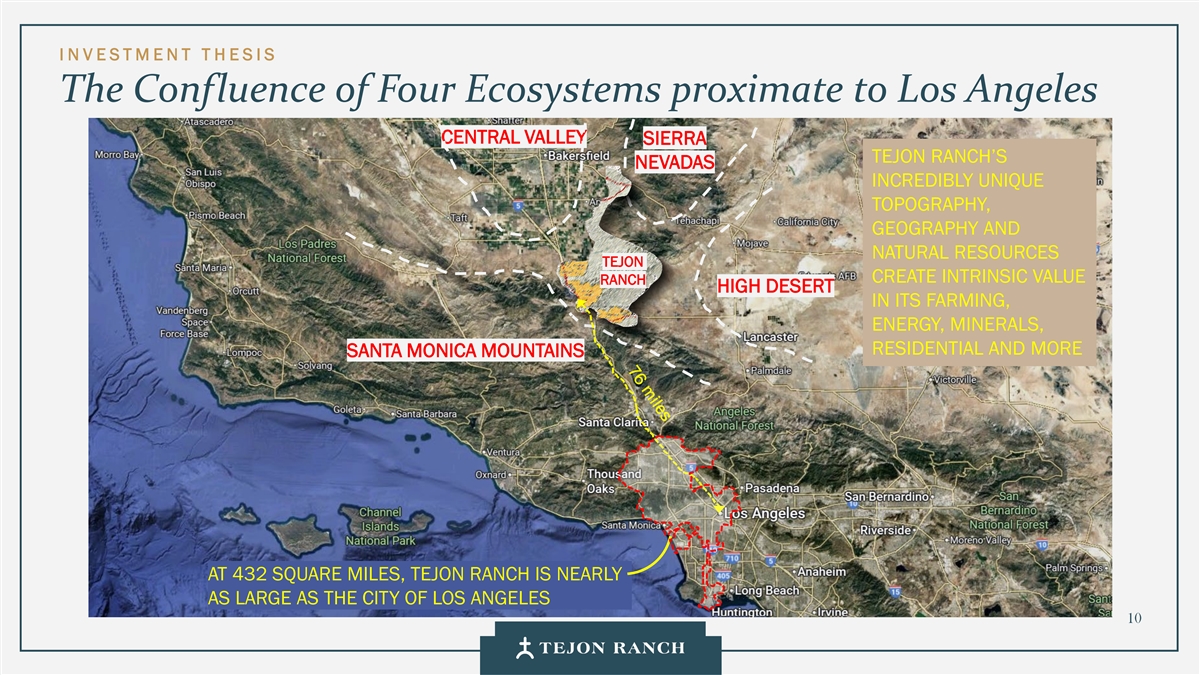 I N VESTMENT T H ESIS Owning the Gateway to California’s Infrastructure Lifelines Tejon Ranch sits at the gateway between the Central Valley and Los Angeles. Everything connecting these two massive economies runs through our land • Highways (Interstate 5, SR 138, SR 58) • Rail (Union Pacific, High Speed Rail TBD) • California Aqueduct • Power transmission lines (PG&E, SCE) • Fiber (AT&T, CVIN) We’re not just landowners—we’re gatekeepers. Tejon Ranch is strategically positioned at the center of the hourglass between Northern and Southern Kern Co. California, capturing revenue from California’s many Los Angeles Co. infrastructure lifelines. 9