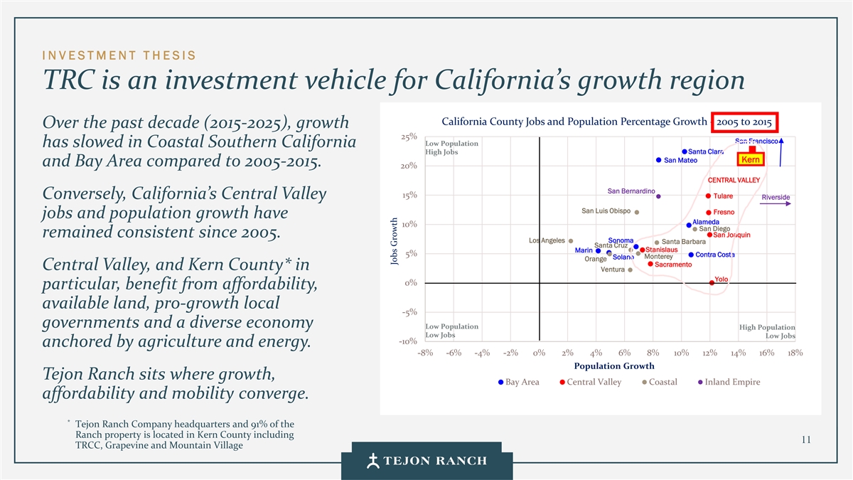 I N VESTMENT T H ESIS TRC is an investment vehicle for California’s growth region California County Jobs and Population Percentage Growth - 2005 to 2015 Over the past decade (2015-2025), growth 25% San Francisco Low Population has slowed in Coastal Southern California Santa Clara High Jobs Kern San Mateo Kern and Bay Area compared to 2005-2015. 20% CENTRAL VALLEY San Bernardino 15% Tulare Conversely, California’s Central Valley Riverside San Luis Obispo Fresno jobs and population growth have Alameda 10% San Diego remained consistent since 2005. San Joaquin Los Angeles Sonoma Santa Barbara Santa Cruz Marin Stanislaus 5% Contra Costa Monterey Solano Orange Sacramento Central Valley, and Kern County* in Ventura Yolo 0% particular, benefit from affordability, available land, pro-growth local -5% governments and a diverse economy Low Population High Population Low Jobs Low Jobs -10% anchored by agriculture and energy. -8% -6% -4% -2% 0% 2% 4% 6% 8% 10% 12% 14% 16% 18% Population Growth Tejon Ranch sits where growth, Bay Area Central Valley Coastal Inland Empire affordability and mobility converge. * Tejon Ranch Company headquarters and 91% of the Ranch property is located in Kern County including 11 TRCC, Grapevine and Mountain Village Jobs Growth