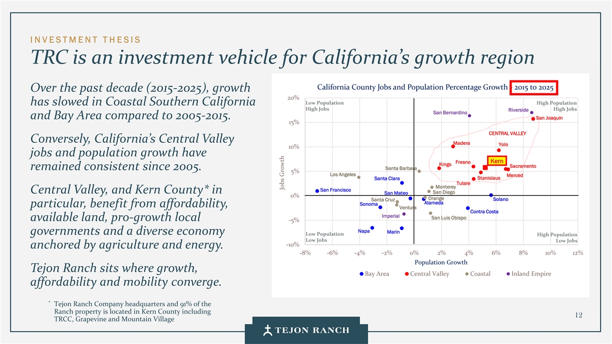 I N VESTMENT T H ESIS TRC is an investment vehicle for California’s growth region California County Jobs and Population Percentage Growth - 2015 to 2025 Over the past decade (2015-2025), growth 20% Low Population High Population has slowed in Coastal Southern California High Jobs High Jobs Riverside San Bernardino and Bay Area compared to 2005-2015. San Joaquin 15% CENTRAL VALLEY Conversely, California’s Central Valley Madera Yolo 10% jobs and population growth have K Kee rn rn Fresno Kings Sacramento remained consistent since 2005. Santa Barbara 5% Los Angeles Merced Stanislaus Santa Clara Tulare Monterey San Francisco Central Valley, and Kern County* in San Diego San Mateo 0% Orange Santa Cruz Solano Alameda Sonoma particular, benefit from affordability, Ventura Contra Costa Imperial San Luis Obispo available land, pro-growth local -5% Napa Marin governments and a diverse economy Low Population High Population Low Jobs Low Jobs -10% anchored by agriculture and energy. -8% -6% -4% -2% 0% 2% 4% 6% 8% 10% 12% Population Growth Tejon Ranch sits where growth, Bay Area Central Valley Coastal Inland Empire affordability and mobility converge. * Tejon Ranch Company headquarters and 91% of the Ranch property is located in Kern County including 12 TRCC, Grapevine and Mountain Village Jobs Growth