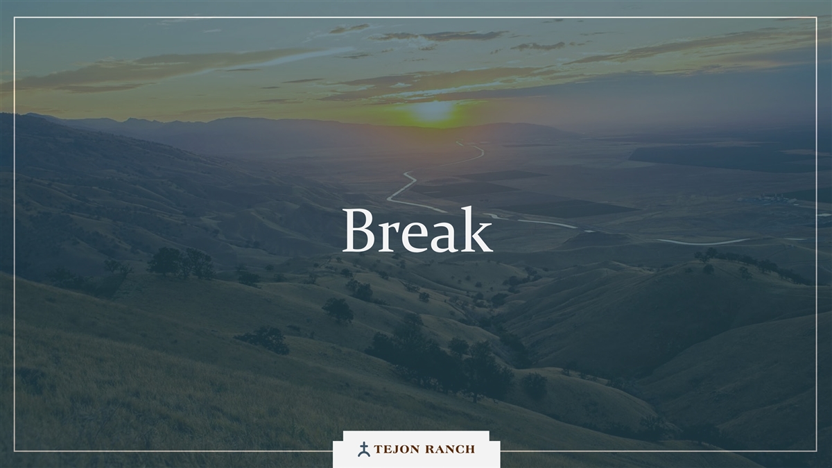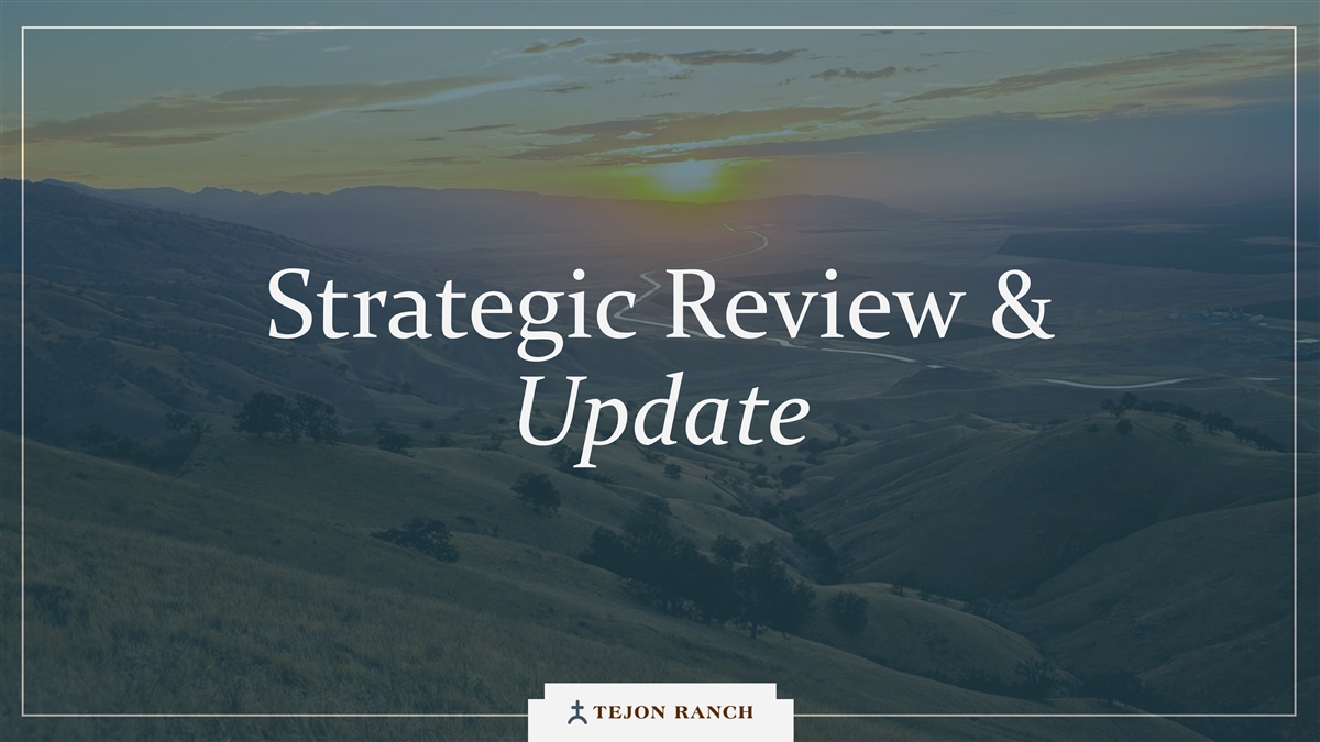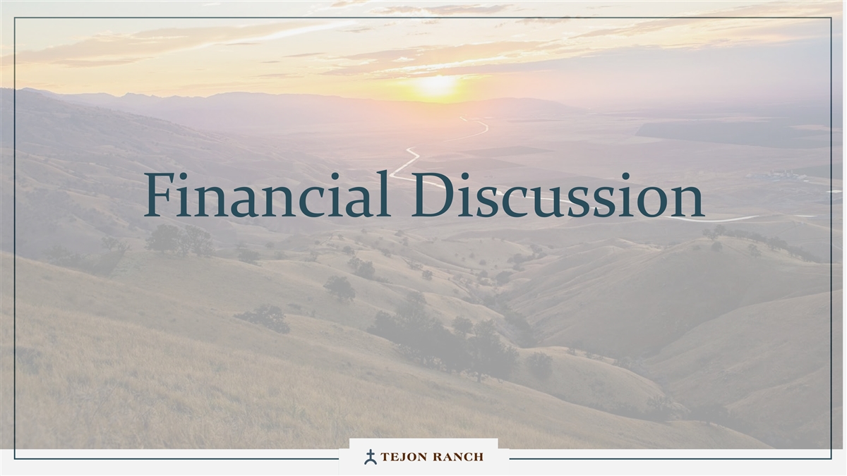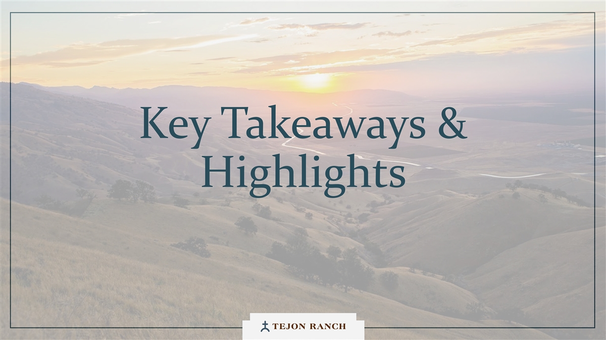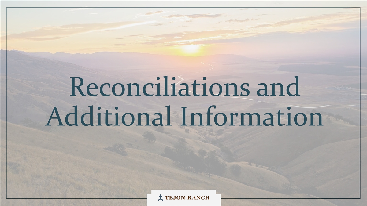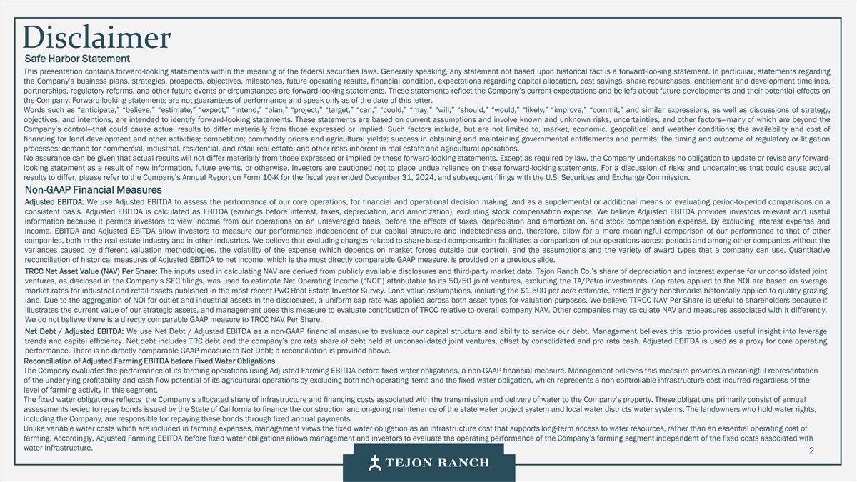 Disclaimer Safe Harbor Statement This presentation contains forward-looking statements within the meaning of the federal securities laws. Generally speaking, any statement not based upon historical fact is a forward-looking statement. In particular, statements regarding the Company’s business plans, strategies, prospects, objectives, milestones, future operating results, financial condition, expectations regarding capital allocation, cost savings, share repurchases, entitlement and development timelines, partnerships, regulatory reforms, and other future events or circumstances are forward-looking statements. These statements reflect the Company’s current expectations and beliefs about future developments and their potential effects on the Company. Forward-looking statements are not guarantees of performance and speak only as of the date of this letter. Words such as “anticipate,” “believe,” “estimate,” “expect,” “intend,” “plan,” “project,” “target,” “can,” “could,” “may,” “will,” “should,” “would,” “likely,” “improve,” “commit,” and similar expressions, as well as discussions of strategy, objectives, and intentions, are intended to identify forward-looking statements. These statements are based on current assumptions and involve known and unknown risks, uncertainties, and other factors—many of which are beyond the Company’s control—that could cause actual results to differ materially from those expressed or implied. Such factors include, but are not limited to, market, economic, geopolitical and weather conditions; the availability and cost of financing for land development and other activities; competition; commodity prices and agricultural yields; success in obtaining and maintaining governmental entitlements and permits; the timing and outcome of regulatory or litigation processes; demand for commercial, industrial, residential, and retail real estate; and other risks inherent in real estate and agricultural operations. No assurance can be given that actual results will not differ materially from those expressed or implied by these forward-looking statements. Except as required by law, the Company undertakes no obligation to update or revise any forward- looking statement as a result of new information, future events, or otherwise. Investors are cautioned not to place undue reliance on these forward-looking statements. For a discussion of risks and uncertainties that could cause actual results to differ, please refer to the Company’s Annual Report on Form 10-K for the fiscal year ended December 31, 2024, and subsequent filings with the U.S. Securities and Exchange Commission. Non-GAAP Financial Measures Adjusted EBITDA: We use Adjusted EBITDA to assess the performance of our core operations, for financial and operational decision making, and as a supplemental or additional means of evaluating period-to-period comparisons on a consistent basis. Adjusted EBITDA is calculated as EBITDA (earnings before interest, taxes, depreciation, and amortization), excluding stock compensation expense. We believe Adjusted EBITDA provides investors relevant and useful information because it permits investors to view income from our operations on an unleveraged basis, before the effects of taxes, depreciation and amortization, and stock compensation expense. By excluding interest expense and income, EBITDA and Adjusted EBITDA allow investors to measure our performance independent of our capital structure and indebtedness and, therefore, allow for a more meaningful comparison of our performance to that of other companies, both in the real estate industry and in other industries. We believe that excluding charges related to share-based compensation facilitates a comparison of our operations across periods and among other companies without the variances caused by different valuation methodologies, the volatility of the expense (which depends on market forces outside our control), and the assumptions and the variety of award types that a company can use. Quantitative reconciliation of historical measures of Adjusted EBITDA to net income, which is the most directly comparable GAAP measure, is provided on a previous slide. TRCC Net Asset Value (NAV) Per Share: The inputs used in calculating NAV are derived from publicly available disclosures and third-party market data. Tejon Ranch Co.’s share of depreciation and interest expense for unconsolidated joint ventures, as disclosed in the Company’s SEC filings, was used to estimate Net Operating Income (“NOI”) attributable to its 50/50 joint ventures, excluding the TA/Petro investments. Cap rates applied to the NOI are based on average market rates for industrial and retail assets published in the most recent PwC Real Estate Investor Survey. Land value assumptions, including the $1,500 per acre estimate, reflect legacy benchmarks historically applied to quality grazing land. Due to the aggregation of NOI for outlet and industrial assets in the disclosures, a uniform cap rate was applied across both asset types for valuation purposes. We believe TTRCC NAV Per Share is useful to shareholders because it illustrates the current value of our strategic assets, and management uses this measure to evaluate contribution of TRCC relative to overall company NAV. Other companies may calculate NAV and measures associated with it differently. We do not believe there is a directly comparable GAAP measure to TRCC NAV Per Share. Net Debt / Adjusted EBITDA: We use Net Debt / Adjusted EBITDA as a non-GAAP financial measure to evaluate our capital structure and ability to service our debt. Management believes this ratio provides useful insight into leverage trends and capital efficiency. Net debt includes TRC debt and the company’s pro rata share of debt held at unconsolidated joint ventures, offset by consolidated and pro rata cash. Adjusted EBITDA is used as a proxy for core operating perfor