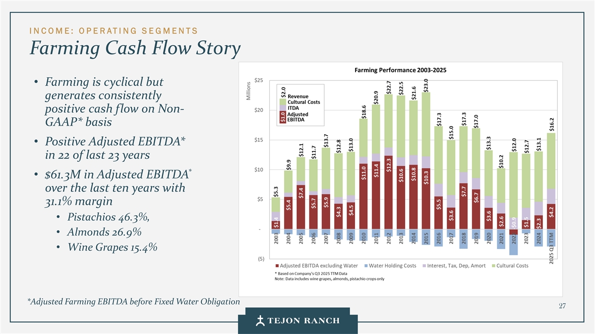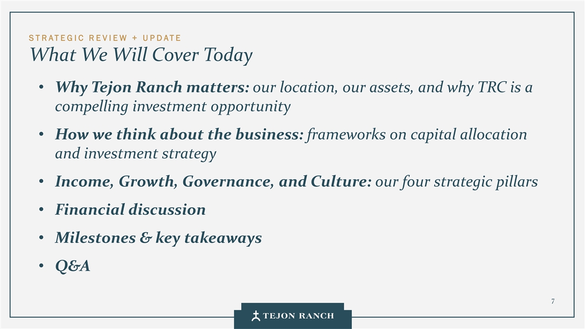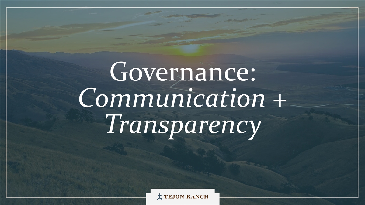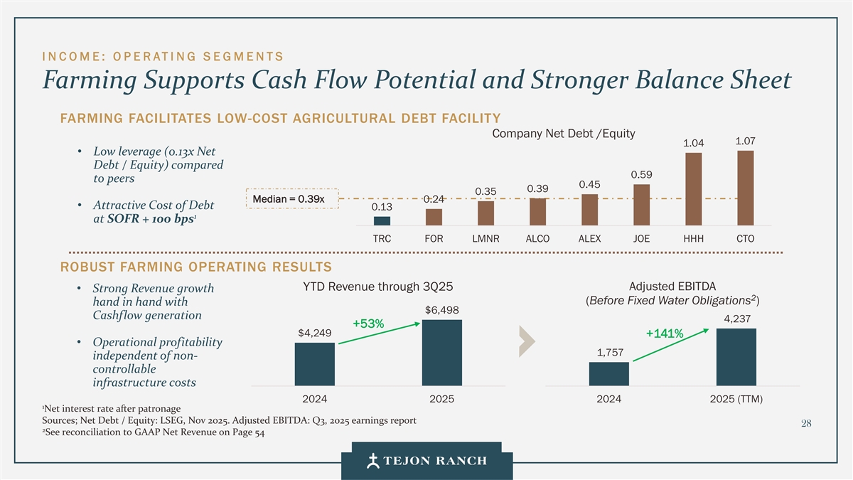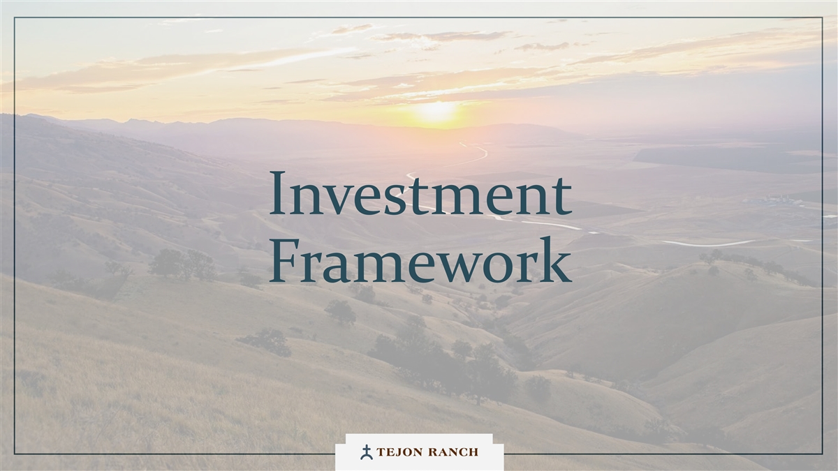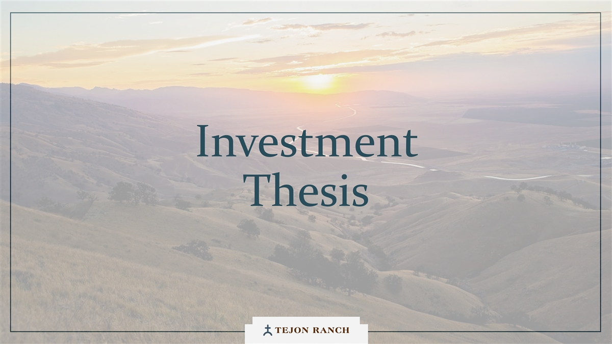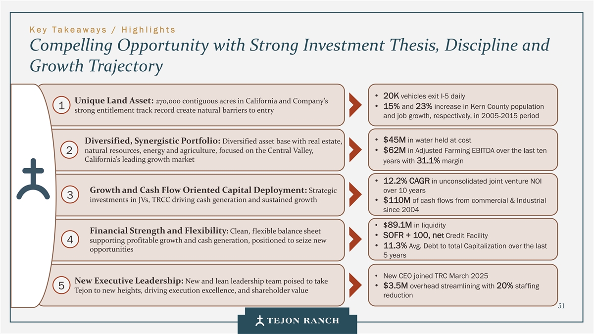 Disclaimer Safe Harbor Statement This presentation contains forward-looking statements within the meaning of the federal securities laws. Generally speaking, any statement not based upon historical fact is a forward-looking statement. In particular, statements regarding the Company’s business plans, strategies, prospects, objectives, milestones, future operating results, financial condition, expectations regarding capital allocation, cost savings, share repurchases, entitlement and development timelines, partnerships, regulatory reforms, and other future events or circumstances are forward-looking statements. These statements reflect the Company’s current expectations and beliefs about future developments and their potential effects on the Company. Forward-looking statements are not guarantees of performance and speak only as of the date of this letter. Words such as “anticipate,” “believe,” “estimate,” “expect,” “intend,” “plan,” “project,” “target,” “can,” “could,” “may,” “will,” “should,” “would,” “likely,” “improve,” “commit,” and similar expressions, as well as discussions of strategy, objectives, and intentions, are intended to identify forward-looking statements. These statements are based on current assumptions and involve known and unknown risks, uncertainties, and other factors—many of which are beyond the Company’s control—that could cause actual results to differ materially from those expressed or implied. Such factors include, but are not limited to, market, economic, geopolitical and weather conditions; the availability and cost of financing for land development and other activities; competition; commodity prices and agricultural yields; success in obtaining and maintaining governmental entitlements and permits; the timing and outcome of regulatory or litigation processes; demand for commercial, industrial, residential, and retail real estate; and other risks inherent in real estate and agricultural operations. No assurance can be given that actual results will not differ materially from those expressed or implied by these forward-looking statements. Except as required by law, the Company undertakes no obligation to update or revise any forward- looking statement as a result of new information, future events, or otherwise. Investors are cautioned not to place undue reliance on these forward-looking statements. For a discussion of risks and uncertainties that could cause actual results to differ, please refer to the Company’s Annual Report on Form 10-K for the fiscal year ended December 31, 2024, and subsequent filings with the U.S. Securities and Exchange Commission. Non-GAAP Financial Measures Adjusted EBITDA: We use Adjusted EBITDA to assess the performance of our core operations, for financial and operational decision making, and as a supplemental or additional means of evaluating period-to-period comparisons on a consistent basis. Adjusted EBITDA is calculated as EBITDA (earnings before interest, taxes, depreciation, and amortization), excluding stock compensation expense. We believe Adjusted EBITDA provides investors relevant and useful information because it permits investors to view income from our operations on an unleveraged basis, before the effects of taxes, depreciation and amortization, and stock compensation expense. By excluding interest expense and income, EBITDA and Adjusted EBITDA allow investors to measure our performance independent of our capital structure and indebtedness and, therefore, allow for a more meaningful comparison of our performance to that of other companies, both in the real estate industry and in other industries. We believe that excluding charges related to share-based compensation facilitates a comparison of our operations across periods and among other companies without the variances caused by different valuation methodologies, the volatility of the expense (which depends on market forces outside our control), and the assumptions and the variety of award types that a company can use. Quantitative reconciliation of historical measures of Adjusted EBITDA to net income, which is the most directly comparable GAAP measure, is provided on a previous slide. TRCC Net Asset Value (NAV) Per Share: The inputs used in calculating NAV are derived from publicly available disclosures and third-party market data. Tejon Ranch Co.’s share of depreciation and interest expense for unconsolidated joint ventures, as disclosed in the Company’s SEC filings, was used to estimate Net Operating Income (“NOI”) attributable to its 50/50 joint ventures, excluding the TA/Petro investments. Cap rates applied to the NOI are based on average market rates for industrial and retail assets published in the most recent PwC Real Estate Investor Survey. Land value assumptions, including the $1,500 per acre estimate, reflect legacy benchmarks historically applied to quality grazing land. Due to the aggregation of NOI for outlet and industrial assets in the disclosures, a uniform cap rate was applied across both asset types for valuation purposes. We believe TTRCC NAV Per Share is useful to shareholders because it illustrates the current value of our strategic assets, and management uses this measure to evaluate contribution of TRCC relative to overall company NAV. Other companies may calculate NAV and measures associated with it differently. We do not believe there is a directly comparable GAAP measure to TRCC NAV Per Share. Net Debt / Adjusted EBITDA: We use Net Debt / Adjusted EBITDA as a non-GAAP financial measure to evaluate our capital structure and ability to service our debt. Management believes this ratio provides useful insight into leverage trends and capital efficiency. Net debt includes TRC debt and the company’s pro rata share of debt held at unconsolidated joint ventures, offset by consolidated and pro rata cash. Adjusted EBITDA is used as a proxy for core operating perfor