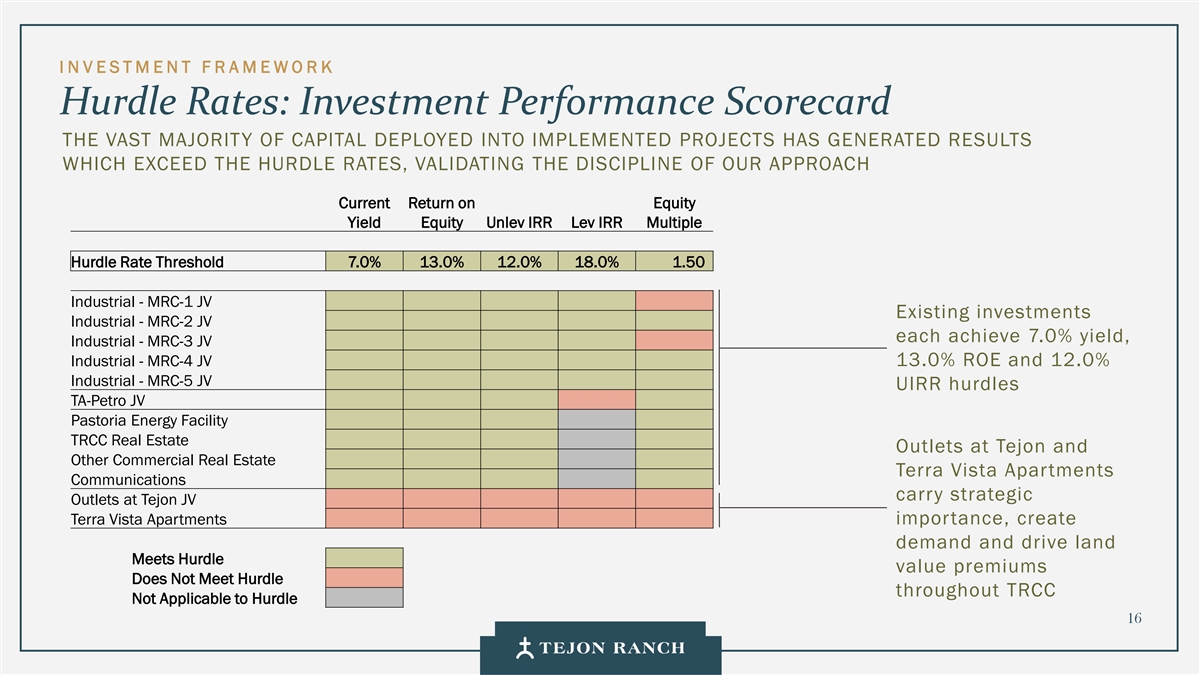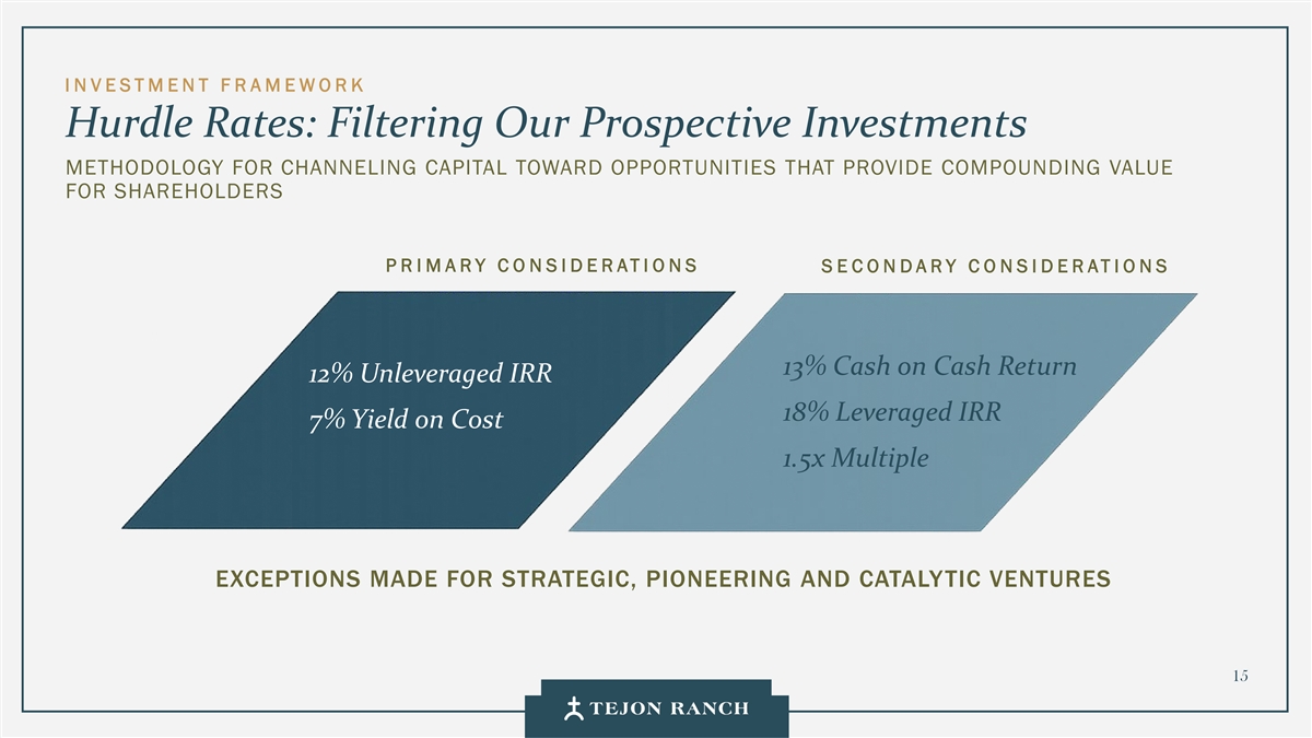 I N VESTMENT F R AMEWORK Hurdle Rates: Filtering Our Prospective Investments METHODOLOGY FOR CHANNELING CAPITAL TOWARD OPPORTUNITIES THAT PROVIDE COMPOUNDING VALUE FOR SHAREHOLDERS P R I MARY C O N SIDERATI ONS S E CONDARY C O NSIDERATIONS 13% Cash on Cash Return 12% Unleveraged IRR 18% Leveraged IRR 7% Yield on Cost 1.5x Multiple EXCEPTIONS MADE FOR STRATEGIC, PIONEERING AND CATALYTIC VENTURES 15