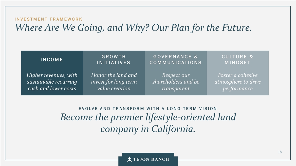 I N VESTMENT F R AMEWORK Where Are We Going, and Why? Our Plan for the Future. G R OW T H GOVERNANCE & CULTURE & I N C O M E IN IT I AT IV E S C O M M U N IC A T IO N S M I N D SE T Higher revenues, with Honor the land and Respect our Foster a cohesive sustainable recurring invest for long term shareholders and be atmosphere to drive cash and lower costs value creation transparent performance E VOLVE AN D T RANSFORM W I TH A LO N G -TERM V I SION Become the premier lifestyle-oriented land company in California. 18