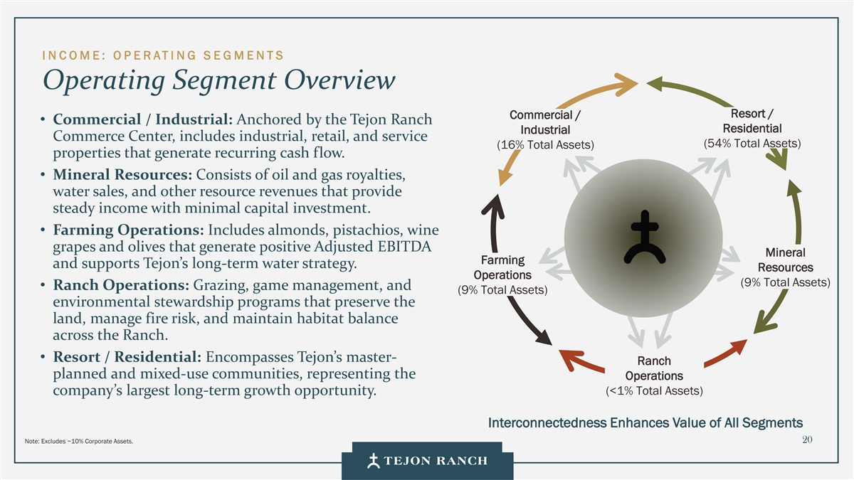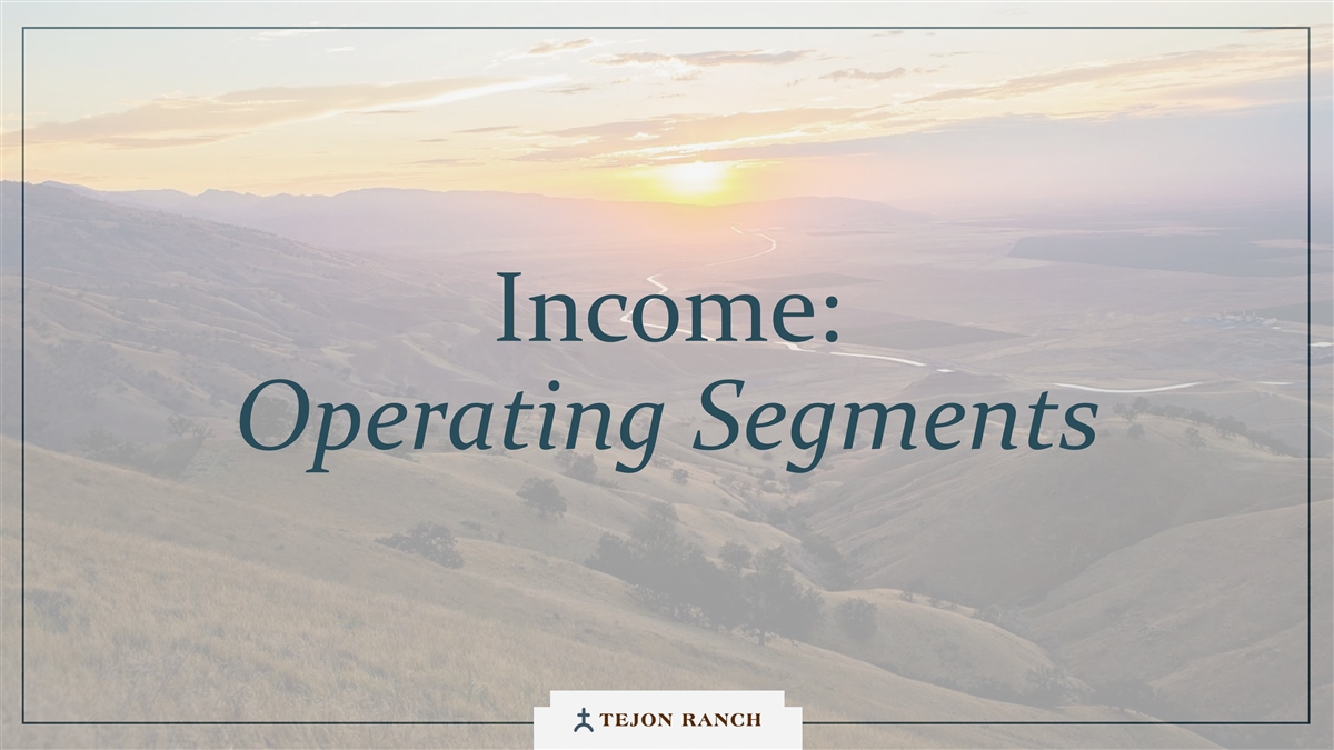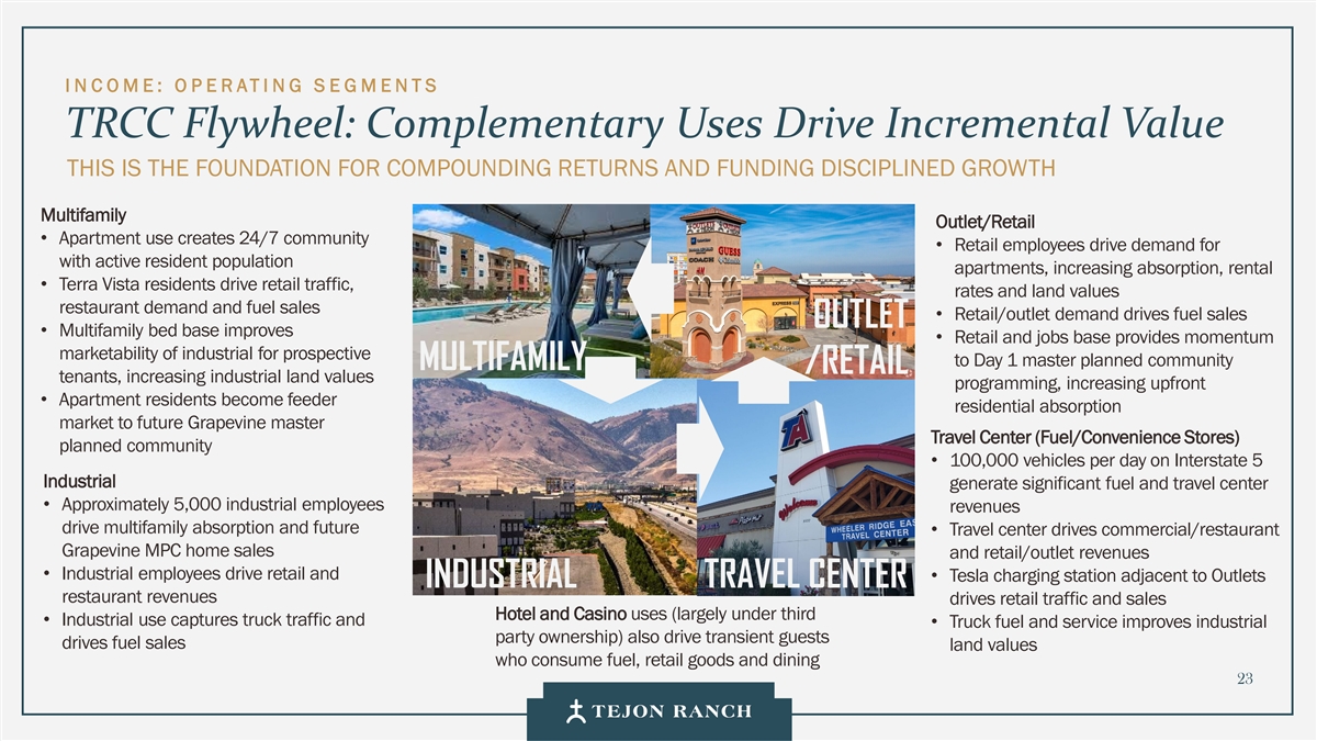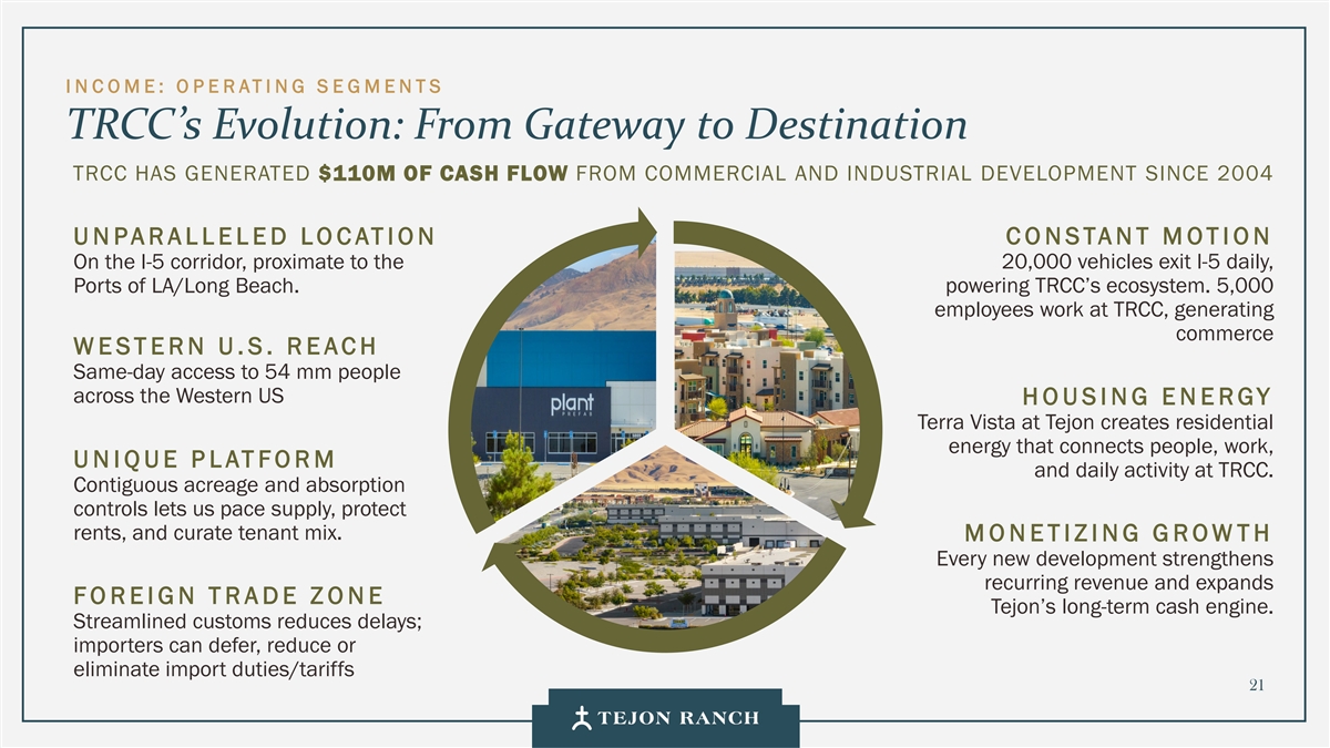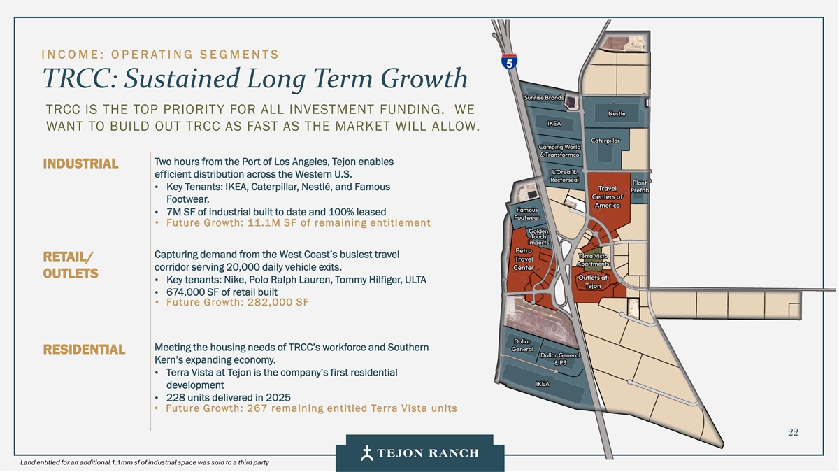 I N C OME: O P E RATI NG S E GMENTS TRCC: Sustained Long Term Growth TRCC IS THE TOP PRIORITY FOR ALL INVESTMENT FUNDING. WE WANT TO BUILD OUT TRCC AS FAST AS THE MARKET WILL ALLOW. Two hours from the Port of Los Angeles, Tejon enables INDUSTRIAL efficient distribution across the Western U.S. • Key Tenants: IKEA, Caterpillar, Nestlé, and Famous Footwear. • 7M SF of industrial built to date and 100% leased • Future Growth: 11.1M SF of remaining entitlement Capturing demand from the West Coast’s busiest travel RETAIL/ corridor serving 20,000 daily vehicle exits. OUTLETS Key tenants: Nike, Polo Ralph Lauren, Tommy Hilfiger, ULTA • 674,000 SF of retail built • • Future Growth: 282,000 SF Meeting the housing needs of TRCC’s workforce and Southern RESIDENTIAL Kern’s expanding economy. Terra Vista at Tejon is the company’s first residential • development 228 units delivered in 2025 • • Future Growth: 267 remaining entitled Terra Vista units 22 Land entitled for an additional 1.1mm sf of industrial space was sold to a third party