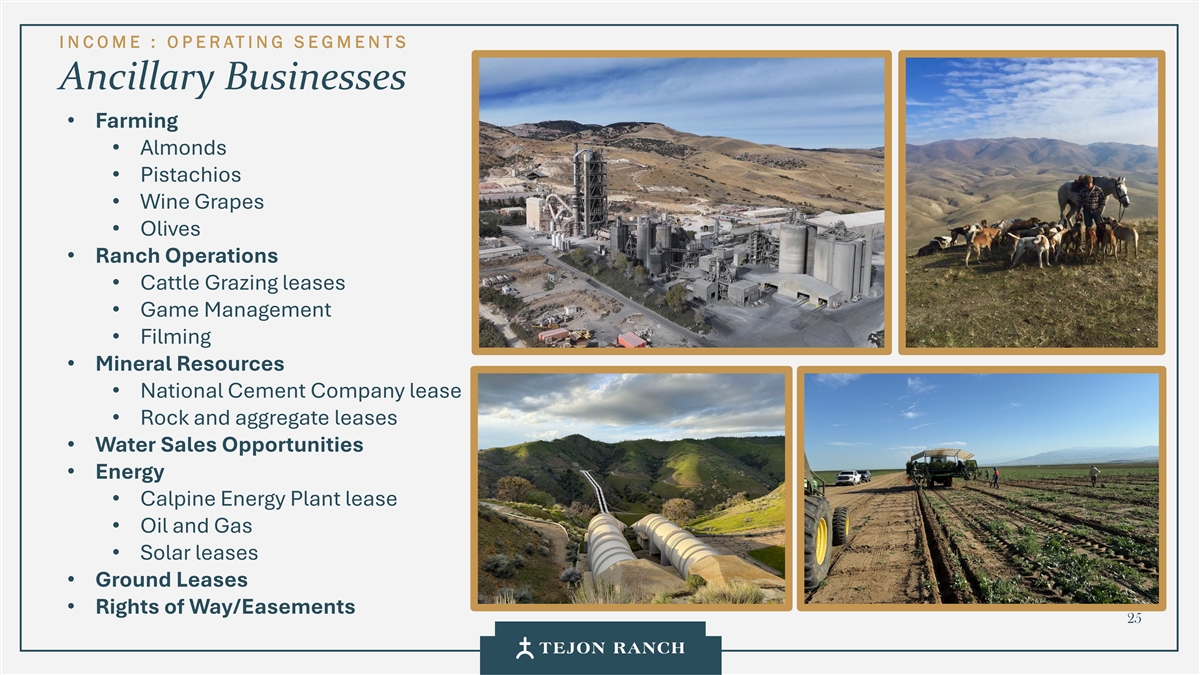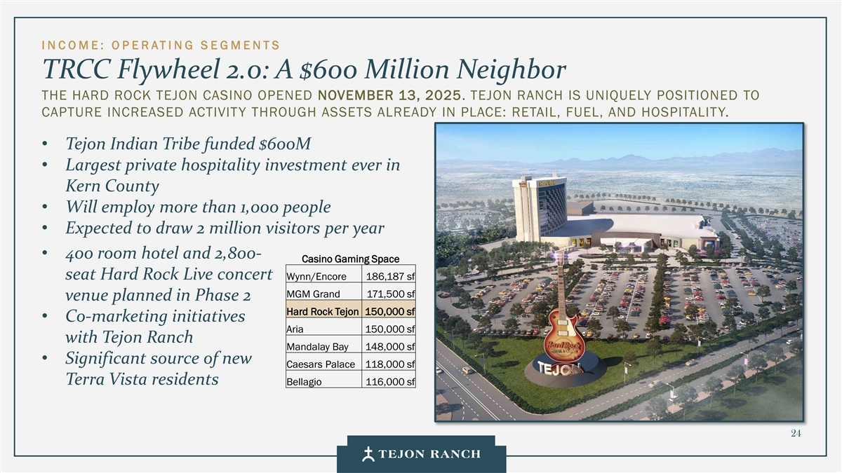 I N C OME: O P E RATI NG S E GMENTS TRCC Flywheel 2.0: A $600 Million Neighbor THE HARD ROCK TEJON CASINO OPENED NOVEMBER 13, 2025. TEJON RANCH IS UNIQUELY POSITIONED TO CAPTURE INCREASED ACTIVITY THROUGH ASSETS ALREADY IN PLACE: RETAIL, FUEL, AND HOSPITALITY. • Tejon Indian Tribe funded $600M • Largest private hospitality investment ever in Kern County • Will employ more than 1,000 people • Expected to draw 2 million visitors per year • 400 room hotel and 2,800- Casino Gaming Space seat Hard Rock Live concert Wynn/Encore 186,187 sf MGM Grand 171,500 sf venue planned in Phase 2 Hard Rock Tejon 150,000 sf • Co-marketing initiatives Aria 150,000 sf with Tejon Ranch Mandalay Bay 148,000 sf • Significant source of new Caesars Palace 118,000 sf Terra Vista residents Bellagio 116,000 sf 24