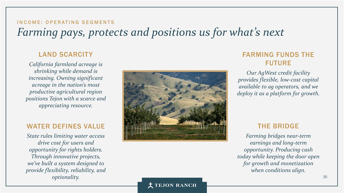 I N C OME : O P E RATING S E GMENTS Ancillary Businesses • Farming • Almonds • Pistachios • Wine Grapes • Olives • Ranch Operations • Cattle Grazing leases • Game Management • Filming • Mineral Resources • National Cement Company lease • Rock and aggregate leases • Water Sales Opportunities • Energy • Calpine Energy Plant lease • Oil and Gas • Solar leases • Ground Leases • Rights of Way/Easements 25