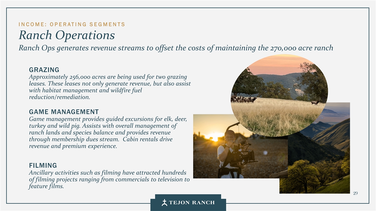 I N C OME: O P E RATI NG S E GMENTS Ranch Operations Ranch Ops generates revenue streams to offset the costs of maintaining the 270,000 acre ranch GRAZING Approximately 256,000 acres are being used for two grazing leases. These leases not only generate revenue, but also assist with habitat management and wildfire fuel reduction/remediation. GAME MANAGEMENT Game management provides guided excursions for elk, deer, turkey and wild pig. Assists with overall management of ranch lands and species balance and provides revenue through membership dues stream. Cabin rentals drive revenue and premium experience. FILMING Ancillary activities such as filming have attracted hundreds of filming projects ranging from commercials to television to feature films. 29