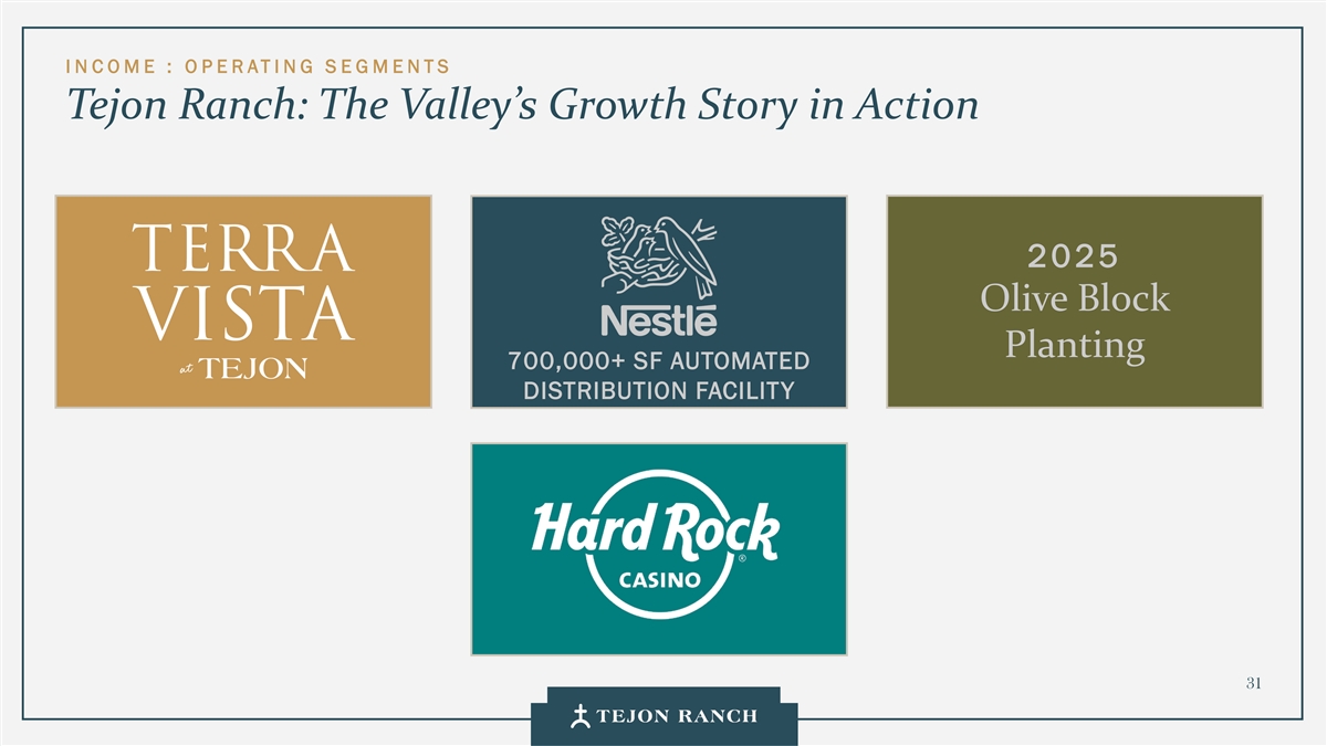 I N C OME : O P E RATING S E GMENTS Tejon Ranch: The Valley’s Growth Story in Action 2025 Olive Block Planting 700,000+ SF AUTOMATED DISTRIBUTION FACILITY 31