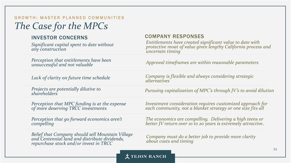 G ROW TH: M A STER P L A N NED C O MMUNITIES The Case for the MPCs COMPANY RESPONSES INVESTOR CONCERNS Entitlements have created significant value to date with Significant capital spent to date without protective moat of value given lengthy California process and any construction uncertain timing Perception that entitlements have been Approval timeframes are within reasonable parameters unsuccessful and not valuable Company is flexible and always considering strategic Lack of clarity on future time schedule alternatives Projects are potentially dilutive to Pursuing capitalization of MPC’s through JV’s to avoid dilution shareholders Investment consideration requires customized approach for Perception that MPC funding is at the expense each community, not a blanket strategy or one size fits all of more deserving TRCC investments The economics are compelling. Delivering a high teens or Perception that go forward economics aren’t better JV return over 10 to 20 years is extremely attractive. compelling Belief that Company should sell Mountain Village Company must do a better job to provide more clarity and Centennial land and distribute dividends, about costs and timing repurchase stock and/or invest in TRCC 34