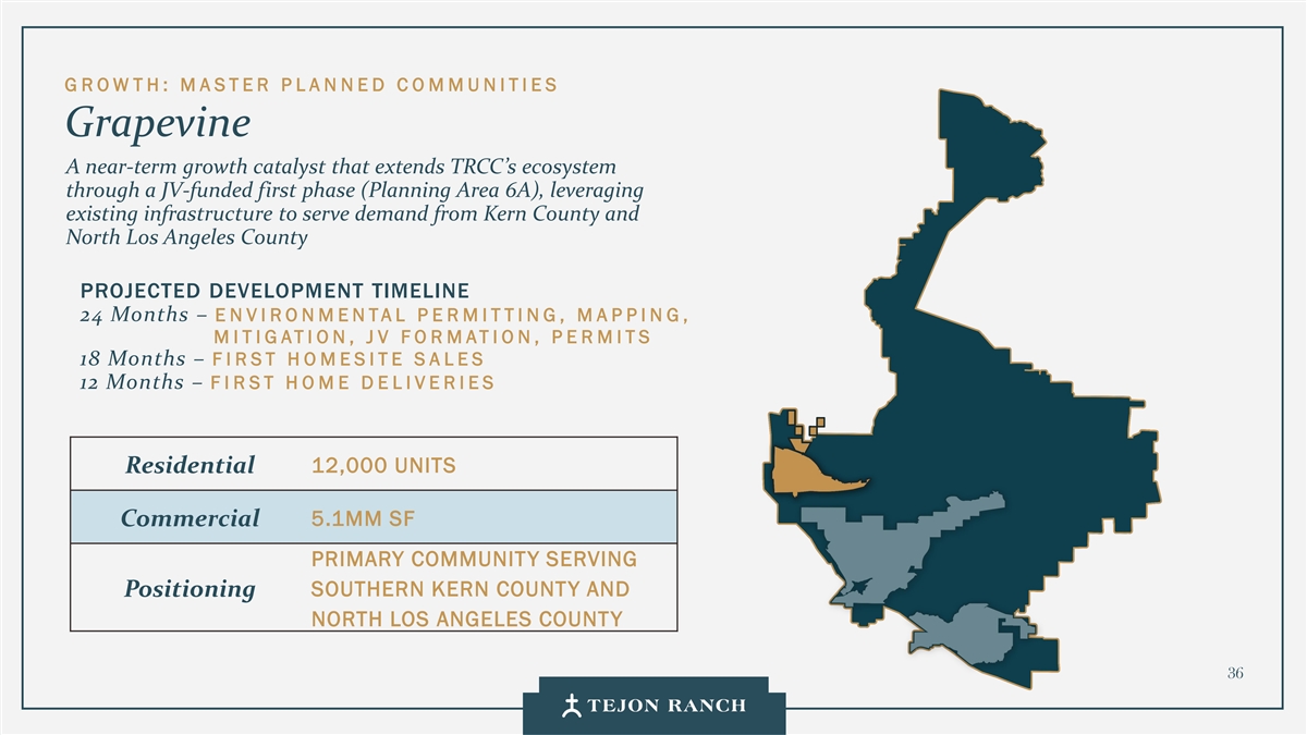 G ROW TH: M A STER P L A N NED C O MMUNITIES Grapevine A near-term growth catalyst that extends TRCC’s ecosystem through a JV-funded first phase (Planning Area 6A), leveraging existing infrastructure to serve demand from Kern County and North Los Angeles County PROJECTED DEVELOPMENT TIMELINE 24 Months – ENVIRONMENTAL PERMITTING, MAPPING, M I TIG ATI ON, J V FO R MATION, P E R MITS 18 Months – F I RST H O MESITE S A LES 12 Months – F I R ST H O M E D E L IVERIES 12,000 UNITS Residential 5.1MM SF Commercial PRIMARY COMMUNITY SERVING SOUTHERN KERN COUNTY AND Positioning NORTH LOS ANGELES COUNTY 36