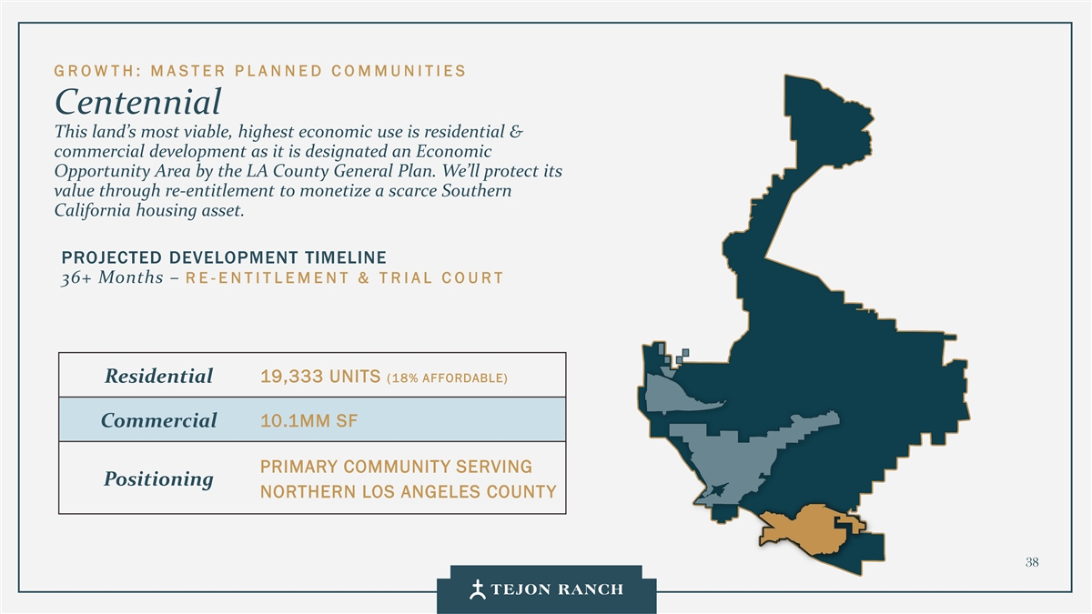 G ROW TH: M A STER P L A N NED C O MMUNITIES Centennial This land’s most viable, highest economic use is residential & commercial development as it is designated an Economic Opportunity Area by the LA County General Plan. We’ll protect its value through re-entitlement to monetize a scarce Southern California housing asset. PROJECTED DEVELOPMENT TIMELINE 36+ Months – RE -ENTITLEMENT & T R IAL C O URT 19,333 UNITS (18% AFFORDABLE) Residential 10.1MM SF Commercial PRIMARY COMMUNITY SERVING Positioning NORTHERN LOS ANGELES COUNTY 38