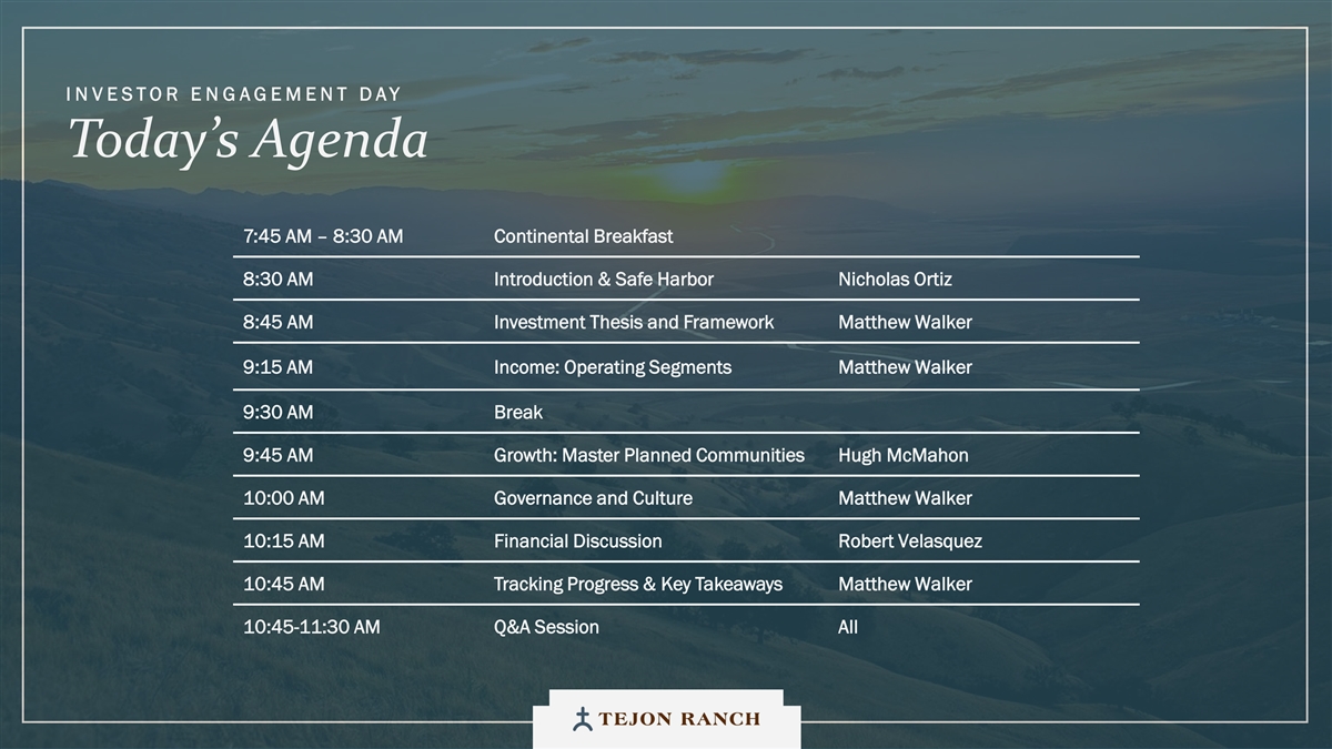 I N VESTOR E N G AGEMENT DAY Today’s Agenda 7:45 AM – 8:30 AM Continental Breakfast 8:30 AM Introduction & Safe Harbor Nicholas Ortiz 8:45 AM Investment Thesis and Framework Matthew Walker 9:15 AM Income: Operating Segments Matthew Walker 9:30 AM Break 9:45 AM Growth: Master Planned Communities Hugh McMahon 10:00 AM Governance and Culture Matthew Walker 10:15 AM Financial Discussion Robert Velasquez 10:45 AM Tracking Progress & Key Takeaways Matthew Walker 10:45-11:30 AM Q&A Session All