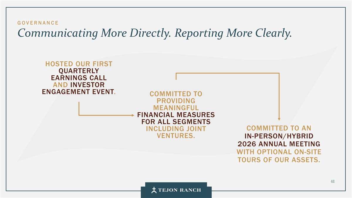 G O VE R NA NC E Communicating More Directly. Reporting More Clearly. HOSTED OUR FIRST QUARTERLY EARNINGS CALL AND INVESTOR ENGAGEMENT EVENT. COMMITTED TO PROVIDING MEANINGFUL FINANCIAL MEASURES FOR ALL SEGMENTS COMMITTED TO AN INCLUDING JOINT VENTURES. IN-PERSON/HYBRID 2026 ANNUAL MEETING WITH OPTIONAL ON-SITE TOURS OF OUR ASSETS. 41