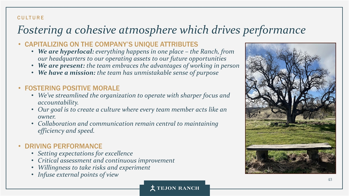 C U L TU RE Fostering a cohesive atmosphere which drives performance • CAPITALIZING ON THE COMPANY’S UNIQUE ATTRIBUTES • We are hyperlocal: everything happens in one place – the Ranch, from our headquarters to our operating assets to our future opportunities • We are present: the team embraces the advantages of working in person • We have a mission: the team has unmistakable sense of purpose • FOSTERING POSITIVE MORALE • We’ve streamlined the organization to operate with sharper focus and accountability. • Our goal is to create a culture where every team member acts like an owner. • Collaboration and communication remain central to maintaining efficiency and speed. • DRIVING PERFORMANCE • Setting expectations for excellence • Critical assessment and continuous improvement • Willingness to take risks and experiment • Infuse external points of view 43