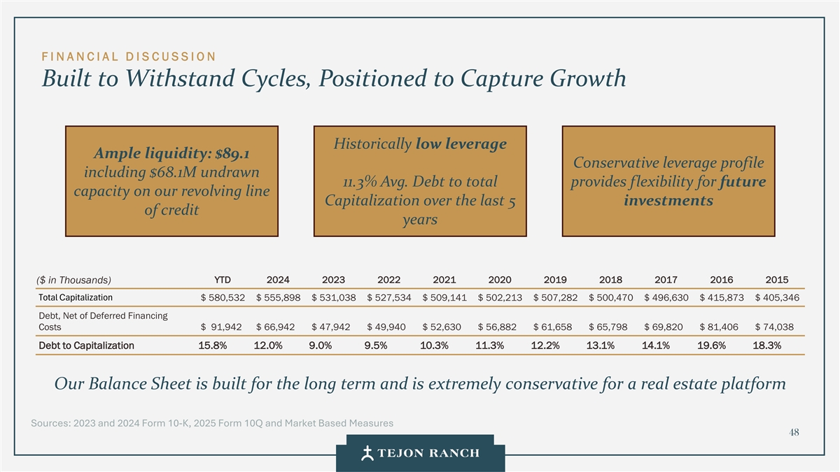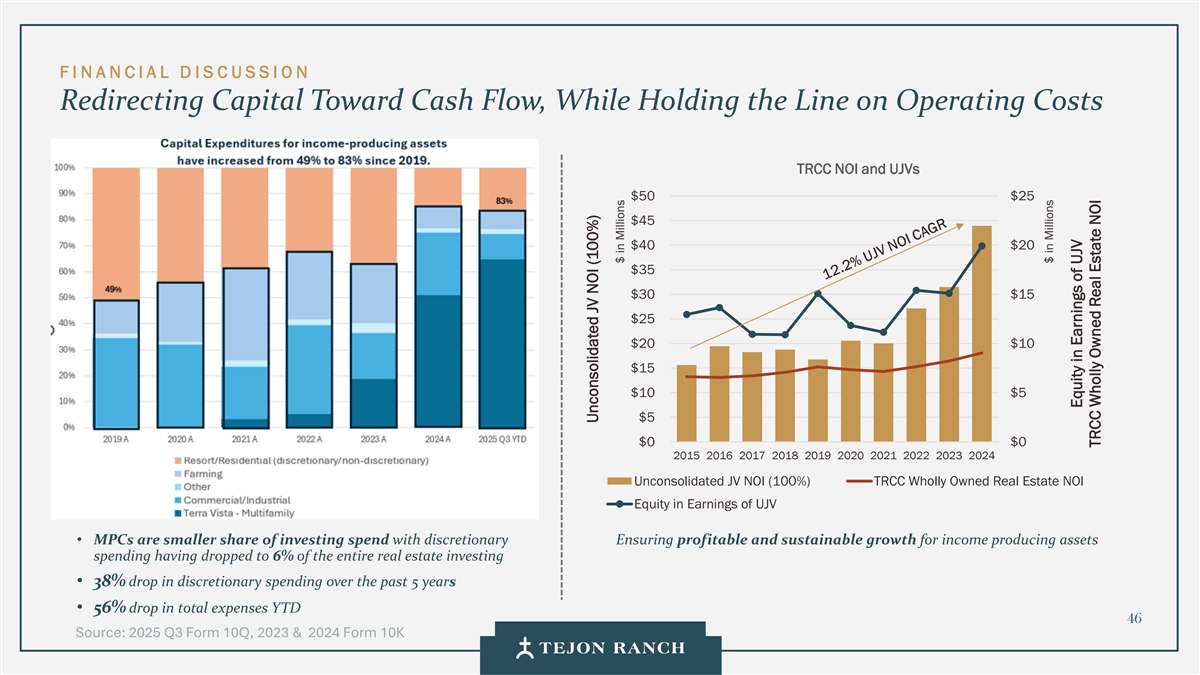 F I N A N C I A L D I S C U SSI O N Redirecting Capital Toward Cash Flow, While Holding the Line on Operating Costs TRCC NOI and UJVs $50 $25 $45 $40 $20 $35 $30 $15 $25 $20 $10 $15 $10 $5 $5 $0 $0 2015 2016 2017 2018 2019 2020 2021 2022 2023 2024 Unconsolidated JV NOI (100%) TRCC Wholly Owned Real Estate NOI Equity in Earnings of UJV • MPCs are smaller share of investing spend with discretionary Ensuring profitable and sustainable growth for income producing assets spending having dropped to 6% of the entire real estate investing • 38% drop in discretionary spending over the past 5 years • 56% drop in total expenses YTD 46 Source: 2025 Q3 Form 10Q, 2023 & 2024 Form 10K Unconsolidated JV NOI (100%) $ in Millions $ in Millions Equity in Earnings of UJV TRCC Wholly Owned Real Estate NOI