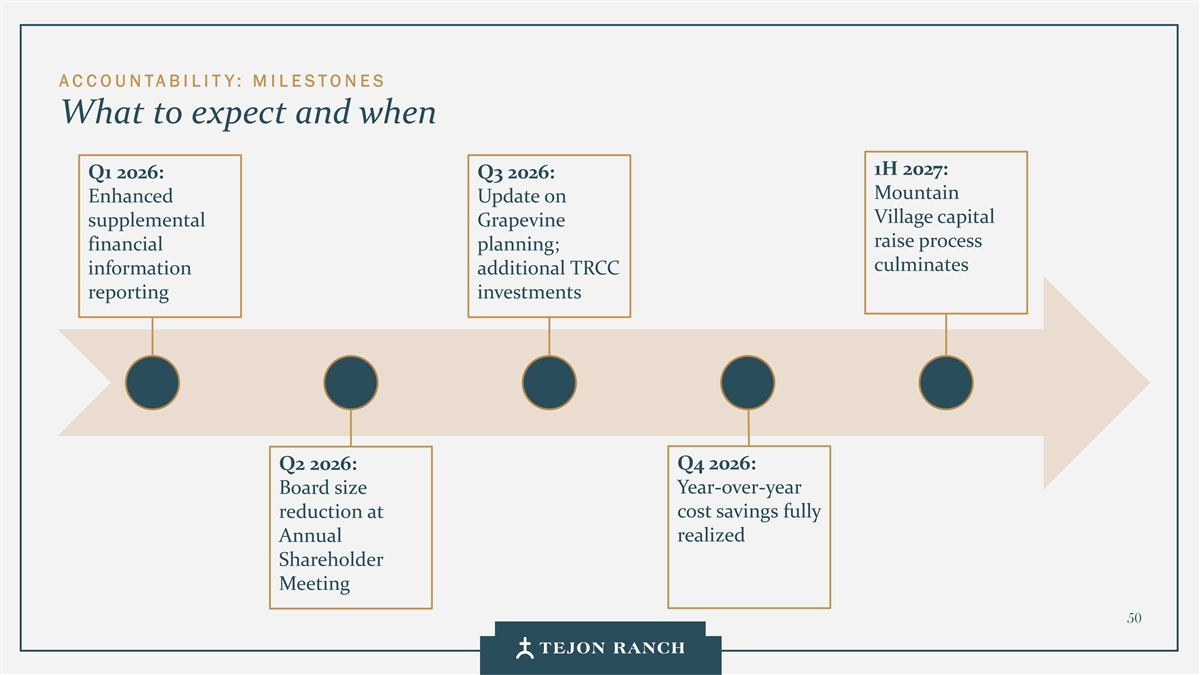 AC COUNTABI LIT Y: M I L ESTONES What to expect and when 1H 2027: Q1 2026: Q3 2026: Mountain Enhanced Update on Village capital supplemental Grapevine raise process financial planning; culminates information additional TRCC reporting investments Q2 2026: Q4 2026: Board size Year-over-year reduction at cost savings fully realized Annual Shareholder Meeting 50
