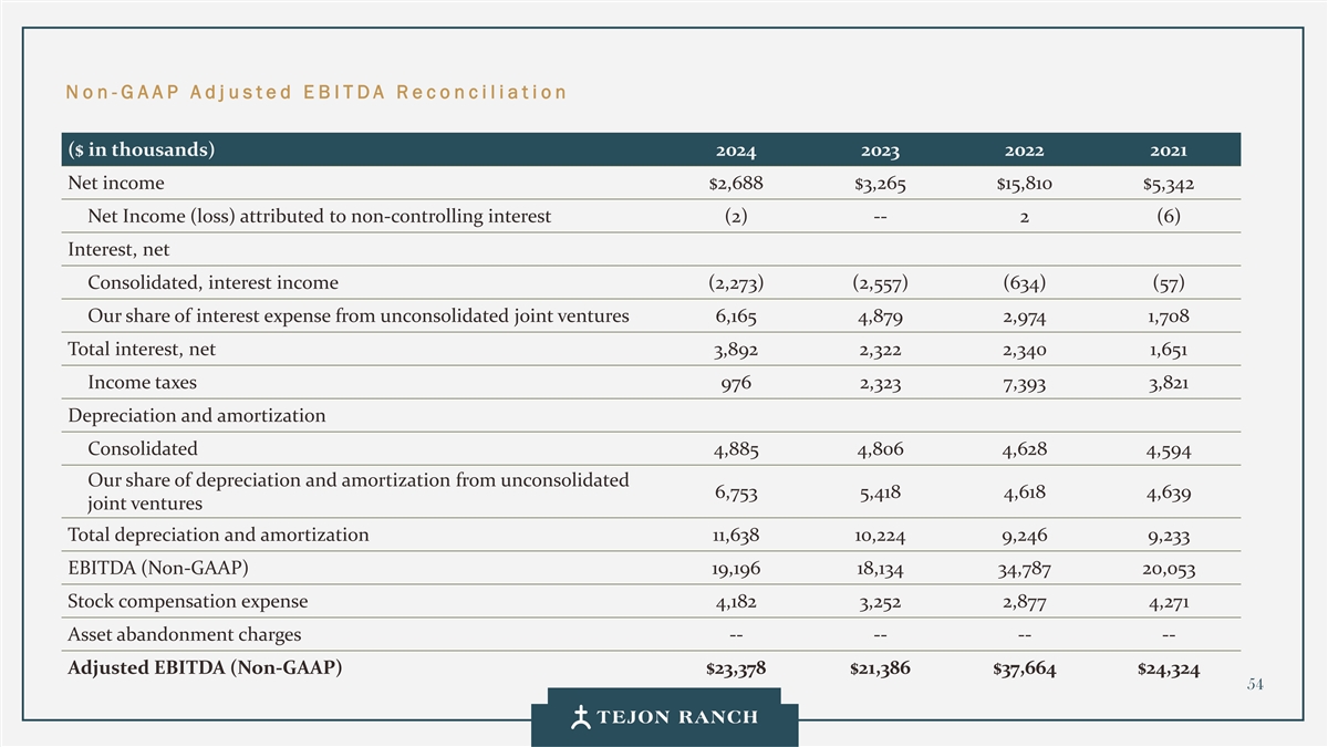 No n -G AAP Adj usted E B ITDA Reconciliat ion ($ in thousands) 2024 2023 2022 2021 Net income $2,688 $3,265 $15,810 $5,342 Net Income (loss) attributed to non-controlling interest (2) -- 2 (6) Interest, net Consolidated, interest income (2,273) (2,557) (634) (57) Our share of interest expense from unconsolidated joint ventures 6,165 4,879 2,974 1,708 Total interest, net 3,892 2,322 2,340 1,651 Income taxes 976 2,323 7,393 3,821 Depreciation and amortization Consolidated 4,885 4,806 4,628 4,594 Our share of depreciation and amortization from unconsolidated 6,753 5,418 4,618 4,639 joint ventures Total depreciation and amortization 11,638 10,224 9,246 9,233 EBITDA (Non-GAAP) 19,196 18,134 34,787 20,053 Stock compensation expense 4,182 3,252 2,877 4,271 Asset abandonment charges -- -- -- -- Adjusted EBITDA (Non-GAAP) $23,378 $21,386 $37,664 $24,324 54