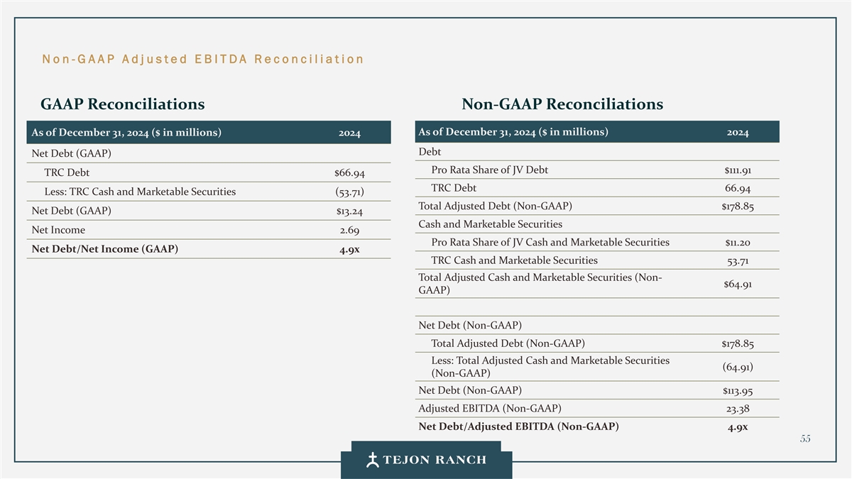 No n -G AAP Adj usted E B ITDA Reconciliat ion GAAP Reconciliations Non-GAAP Reconciliations As of December 31, 2024 ($ in millions) 2024 As of December 31, 2024 ($ in millions) 2024 Debt Net Debt (GAAP) Pro Rata Share of JV Debt $111.91 TRC Debt $66.94 TRC Debt 66.94 Less: TRC Cash and Marketable Securities (53.71) Total Adjusted Debt (Non-GAAP) $178.85 Net Debt (GAAP) $13.24 Cash and Marketable Securities Net Income 2.69 Pro Rata Share of JV Cash and Marketable Securities $11.20 Net Debt/Net Income (GAAP) 4.9x TRC Cash and Marketable Securities 53.71 Total Adjusted Cash and Marketable Securities (Non- $64.91 GAAP) Net Debt (Non-GAAP) Total Adjusted Debt (Non-GAAP) $178.85 Less: Total Adjusted Cash and Marketable Securities (64.91) (Non-GAAP) Net Debt (Non-GAAP) $113.95 Adjusted EBITDA (Non-GAAP) 23.38 Net Debt/Adjusted EBITDA (Non-GAAP) 4.9x 55