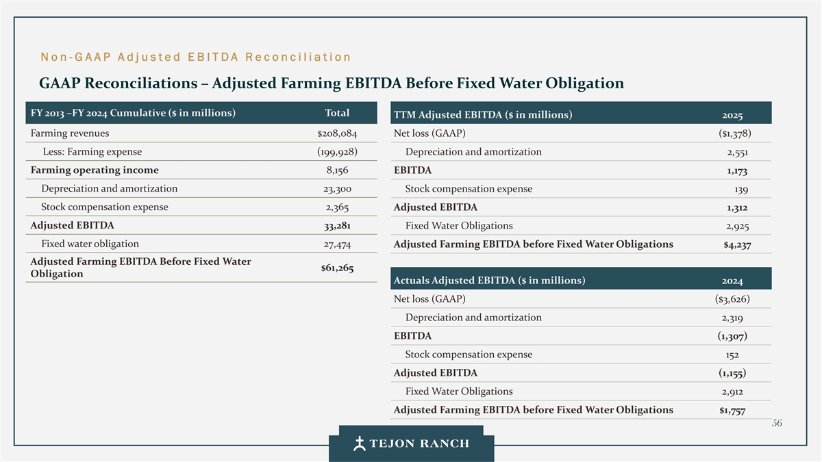 No n -G AAP Adj usted E B ITDA Reconciliat ion GAAP Reconciliations – Adjusted Farming EBITDA Before Fixed Water Obligation FY 2013 –FY 2024 Cumulative ($ in millions) Total TTM Adjusted EBITDA ($ in millions) 2025 Farming revenues $208,084 Net loss (GAAP) ($1,378) Less: Farming expense (199,928) Depreciation and amortization 2,551 Farming operating income 8,156 EBITDA 1,173 Depreciation and amortization 23,300 Stock compensation expense 139 Stock compensation expense 2,365 Adjusted EBITDA 1,312 Adjusted EBITDA 33,281 Fixed Water Obligations 2,925 Fixed water obligation 27,474 Adjusted Farming EBITDA before Fixed Water Obligations $4,237 Adjusted Farming EBITDA Before Fixed Water $61,265 Obligation Actuals Adjusted EBITDA ($ in millions) 2024 Net loss (GAAP) ($3,626) Depreciation and amortization 2,319 EBITDA (1,307) Stock compensation expense 152 Adjusted EBITDA (1,155) Fixed Water Obligations 2,912 Adjusted Farming EBITDA before Fixed Water Obligations $1,757 56