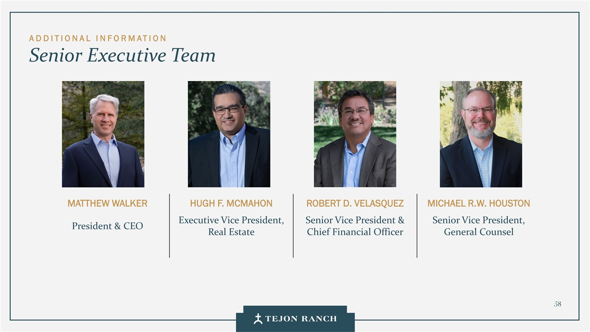 A D D ITIONAL I N FO RMATION Senior Executive Team MATTHEW WALKER HUGH F. MCMAHON ROBERT D. VELASQUEZ MICHAEL R.W. HOUSTON Executive Vice President, Senior Vice President & Senior Vice President, President & CEO Real Estate Chief Financial Officer General Counsel 58