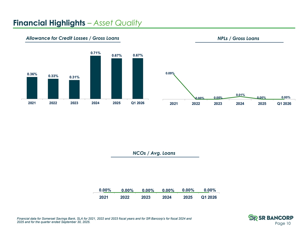 Financial Highlights – Asset Quality Allowance for Credit Losses / Gross Loans NPLs / Gross Loans 0.71% 0.67% 0.67% 0.09% 0.36% 0.33% 0.31% 0.01% 0.00% 0.00% 0.00% 0.00% 2021 2022 2023 2024 2025 Q1 2026 2021 2022 2023 2024 2025 Q1 2026 NCOs / Avg. Loans 0.00% 0.00% 0.00% 0.00% 0.00% 0.00% 2021 2022 2023 2024 2025 Q1 2026 Financial data for Somerset Savings Bank, SLA for 2021, 2022 and 2023 fiscal years and for SR Bancorp’s for fiscal 2024 and 2025 and for the quarter ended September 30, 2025. Page 10
