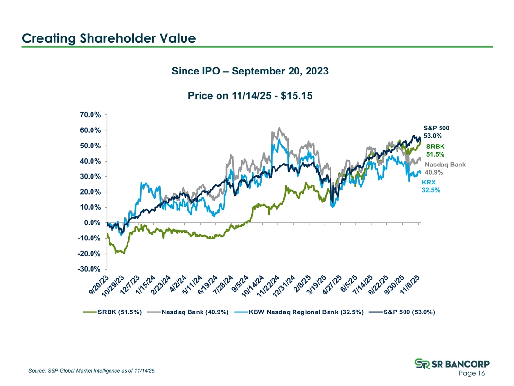 Tangible Book Value Growth 50.0% 53.5% 52.6% 51.3% 61.4% 64.6% 65.2% 72.3% 79.1% P/TBV $16.00 $19.50 $15.00 $19.00 $14.00 $13.00 $18.50 $12.00 $18.00 $11.00 $10.00 $17.50 $9.00 $8.00 $17.00 9/30/23 12/31/23 3/31/24 6/30/24 9/30/24 12/31/24 3/31/25 6/30/25 9/30/25 TBV Stock Price Source: S&P Global Market Intelligence. Page 15 Stock Price TBV