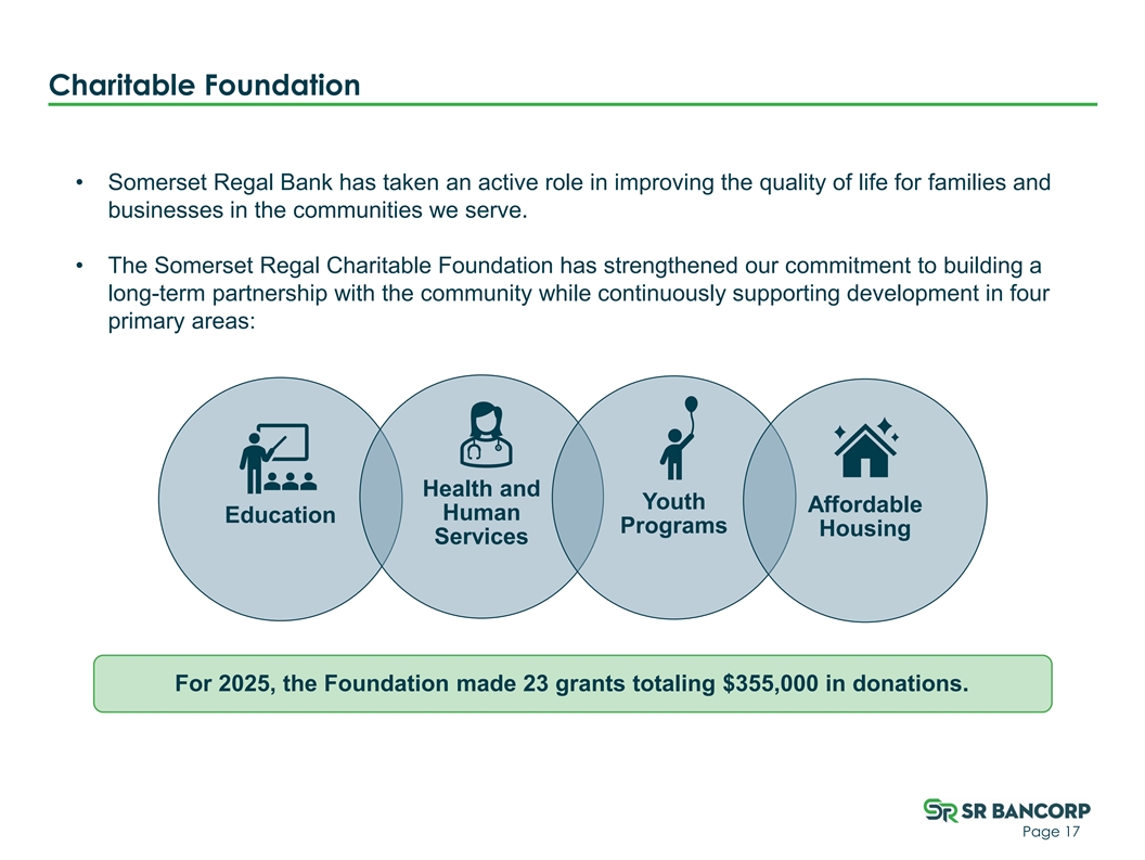Charitable Foundation • Somerset Regal Bank has taken an active role in improving the quality of life for families and businesses in the communities we serve. • The Somerset Regal Charitable Foundation has strengthened our commitment to building a long-term partnership with the community while continuously supporting development in four primary areas: Health and Youth Affordable Human Education Programs Housing Services For 2025, the Foundation made 23 grants totaling $355,000 in donations. Page 17