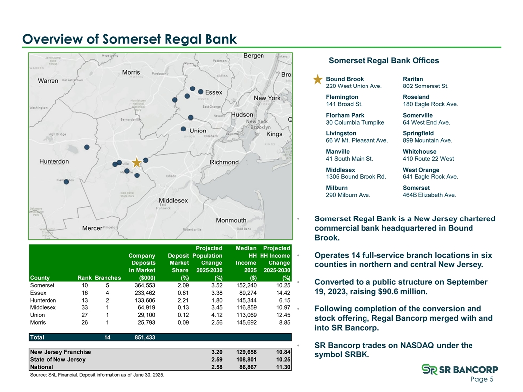 Overview of Somerset Regal Bank Somerset Regal Bank Offices Bound Brook Raritan 220 West Union Ave. 802 Somerset St. Flemington Roseland 141 Broad St. 180 Eagle Rock Ave. Florham Park Somerville 30 Columbia Turnpike 64 West End Ave. Livingston Springfield 66 W Mt. Pleasant Ave. 899 Mountain Ave. Manville Whitehouse 41 South Main St. 410 Route 22 West Middlesex West Orange 1305 Bound Brook Rd. 641 Eagle Rock Ave. Milburn Somerset 290 Milburn Ave. 464B Elizabeth Ave. • Somerset Regal Bank is a New Jersey chartered commercial bank headquartered in Bound Brook. Projected Median Projected Company Deposit Population HH HH Income • Operates 14 full-service branch locations in six Deposits Market Change Income Change counties in northern and central New Jersey. in Market Share 2025-2030 2025 2025-2030 County Rank Branches ($000) (%) (%) ($) (%) • Converted to a public structure on September Somerset 10 5 364,553 2.09 3.52 152,240 10.25 19, 2023, raising $90.6 million. Essex 16 4 233,462 0.81 3.38 89,274 14.42 Hunterdon 13 2 133,606 2.21 1.80 145,344 6.15 Middlesex 33 1 64,919 0.13 3.45 116,859 10.97 • Following completion of the conversion and Union 27 1 29,100 0.12 4.12 113,069 12.45 stock offering, Regal Bancorp merged with and Morris 26 1 25,793 0.09 2.56 145,692 8.85 into SR Bancorp. Total 14 851,433 • SR Bancorp trades on NASDAQ under the New Jersey Franchise 3.20 129,658 10.84 symbol SRBK. State of New Jersey 2.59 108,801 10.25 National 2.58 86,867 11.30 Source: SNL Financial. Deposit information as of June 30, 2025. Page 5