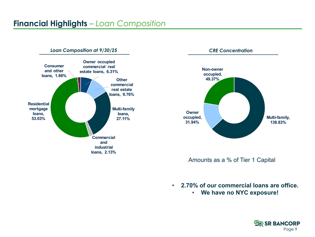 Financial Highlights – Total Loans At September 30, Dollars in Thousands 2023 2024 2025 Owner occupied commercial real estate loans $ 60,850 $ 59,229 $ 52, 385 Other commercial real estate loans 75,357 75,415 80,969 Multi-family loans 171,427 205,929 224, 867 Commercial and industrial loans 12,789 12,092 17,646 Total commercial loans 320,423 352,665 375,867 Residential mortgage loans 362,704 406,258 439, 851 Consumer and other loans 12,371 11,706 13,786 Total loans 695,498 770,629 829,504 Allowance for credit losses (5,325) ( 5,075) (5,533) Deferred loan costs, net 2,230 2,163 2,400 Loans receivable, net $ 692,403 $ 767,717 $ 826,371 Page 8