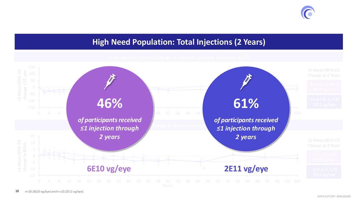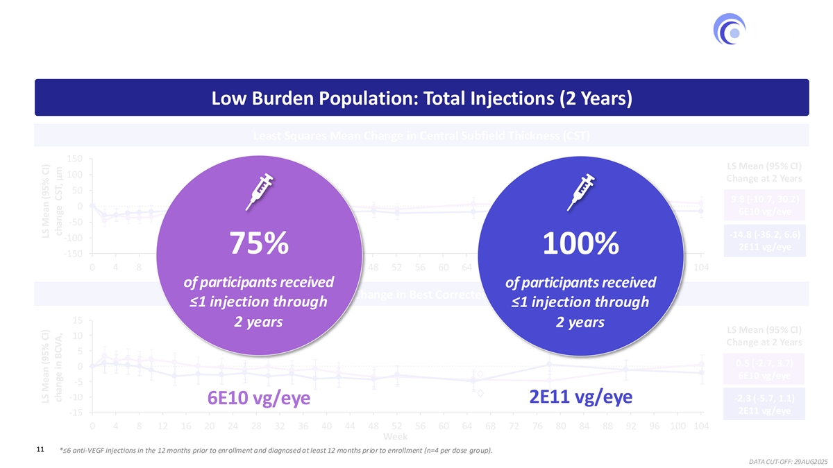Robust and Consistent Reduction in Injection Burden * 75%−100% of participants with lower treatment burden received ≤1 injection cumulatively through 2 years Low Burden Population: Total Injections (2 Years) Least Squares Mean Change in Central Subfield Thickness (CST) 150 LS Mean (95% CI) 100 Change at 2 Years 50 9.8 (-10.7, 30.2) 0 6E10 vg/eye -50 -14.8 (-36.2, 6.6) -100 2E11 vg/eye 75% 100% -150 0 4 8 12 16 20 24 28 32 36 40 44 48 52 56 60 64 68 72 76 80 84 88 92 96 100 104 of participants received of participants received Least Squares Mean Change in Best Corrected Visual Acuity (BCVA) ≤1 injection through ≤1 injection through 15 2 years 2 years LS Mean (95% CI) 10 Change at 2 Years 5 0.5 (-2.7, 3.7) 0 6E10 vg/eye -5 -10 -2.3 (-5.7, 1.1) 2E11 vg/eye 6E10 vg/eye 2E11 vg/eye -15 0 4 8 12 16 20 24 28 32 36 40 44 48 52 56 60 64 68 72 76 80 84 88 92 96 100 104 Week 11 *≤6 anti-VEGF injections in the 12 months prior to enrollment and diagnosed at least 12 months prior to enrollment (n=4 per dose group). DATA CUT-OFF: 29AUG2025 LS Mean (95% CI) LS Mean (95% CI) change in BCVA, change CST, μm