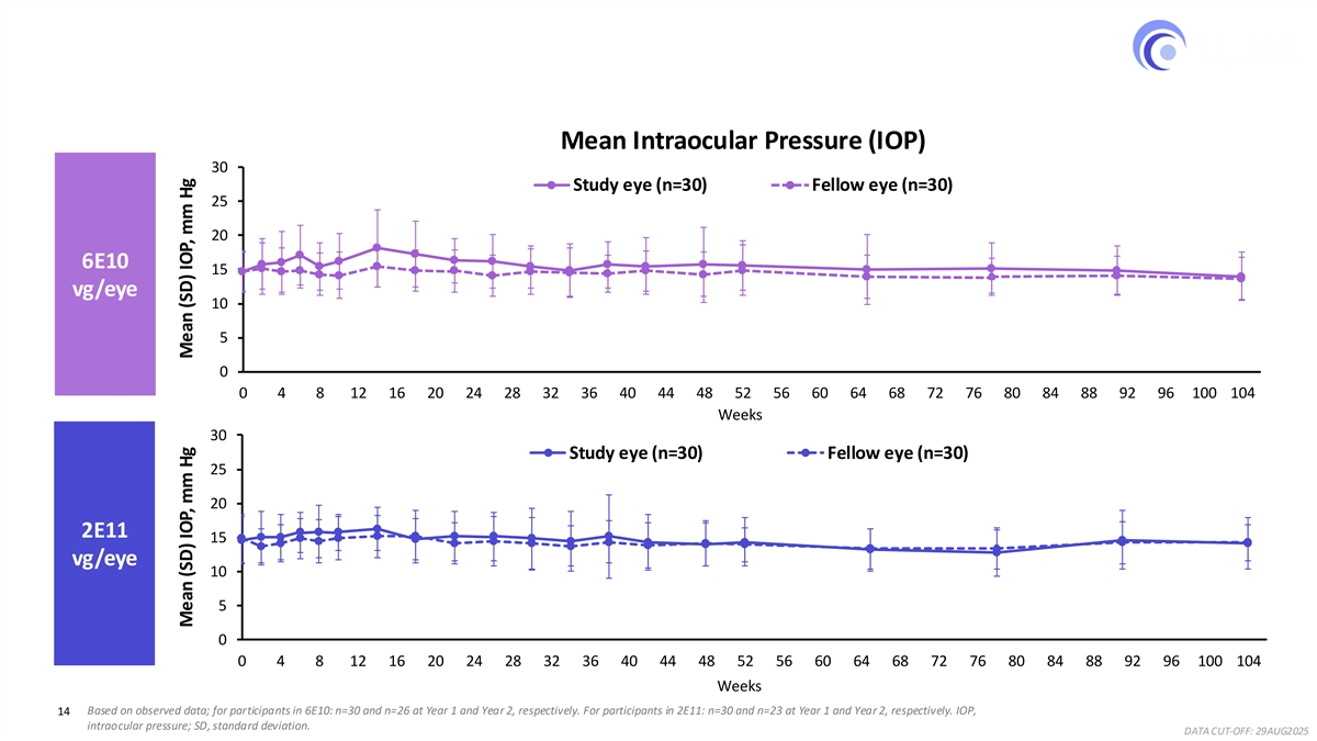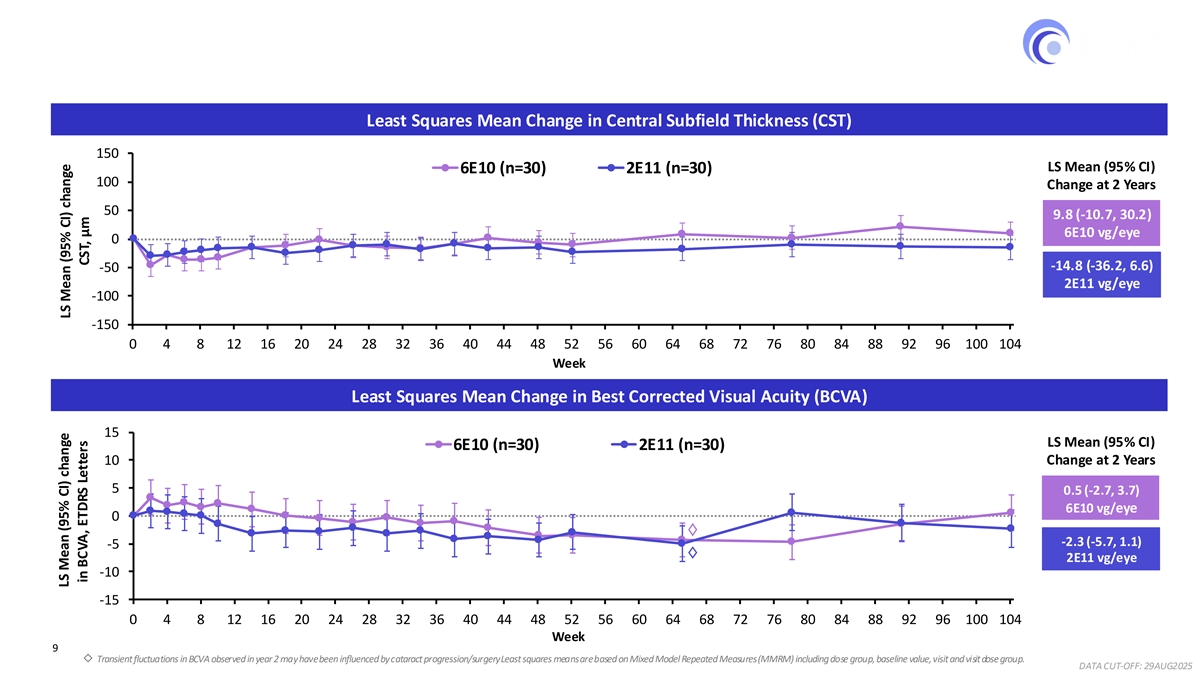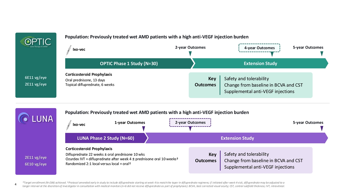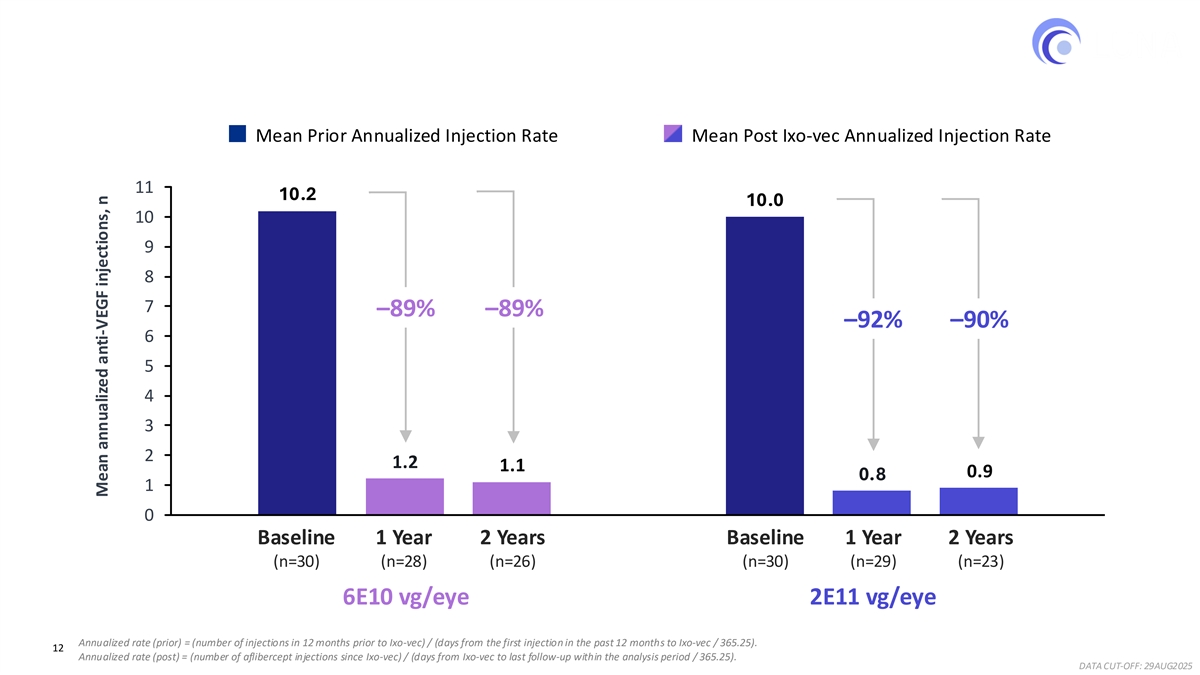 Demographics and Baseline Characteristics LUNA evaluated Ixo-vec in nAMD patients with a high injection burden 6E10 vg/eye 2E11 vg/eye Total N=30 N=30 N=60 Characteristics Mean (SD) age, years 75.4 (8.2) 77.7 (7.4) 76.6 (7.8) Female, n (%) 16 (53) 18 (60) 34 (57) Race, n (%) White 27 (90) 28 (93) 55 (92) Asian 2 (7) 2 (7) 4 (7) Mean (SD) years since nAMD diagnosis in study eye 3.0 (2.9) 3.0 (3.1) 3.0 (2.9) Mean (SD) annualized anti-VEGF injections in prior year 10.2 (1.7) 10.0 (3.3) 10.1 (2.6) Mean (SD) BCVA, ETDRS letters 72.9 (8.8) 71.8 (6.4) 72.3 (7.7) Mean (SD) CST, µm 360.6 (112.0) 340.5 (119.3) 350.6 (115.2) Phakic lens status, n (%) 11 (37) 11 (37) 22 (37) A total of 49 [82%] participants completed the year 2 study visit (n=26 [87%] and n=23 [77%] in the 6E10 and 2E11 groups, respectively). BCVA, best corrected visual acuity: CST, central subfield thickness; 8 ETDRS, Early Treatment Diabetic Retinopathy Study; nAMD, neovascular age-related macular degeneration; SD, standard deviation; VEGF, vascular endothelial growth factor. DATA CUT-OFF: 29AUG2025