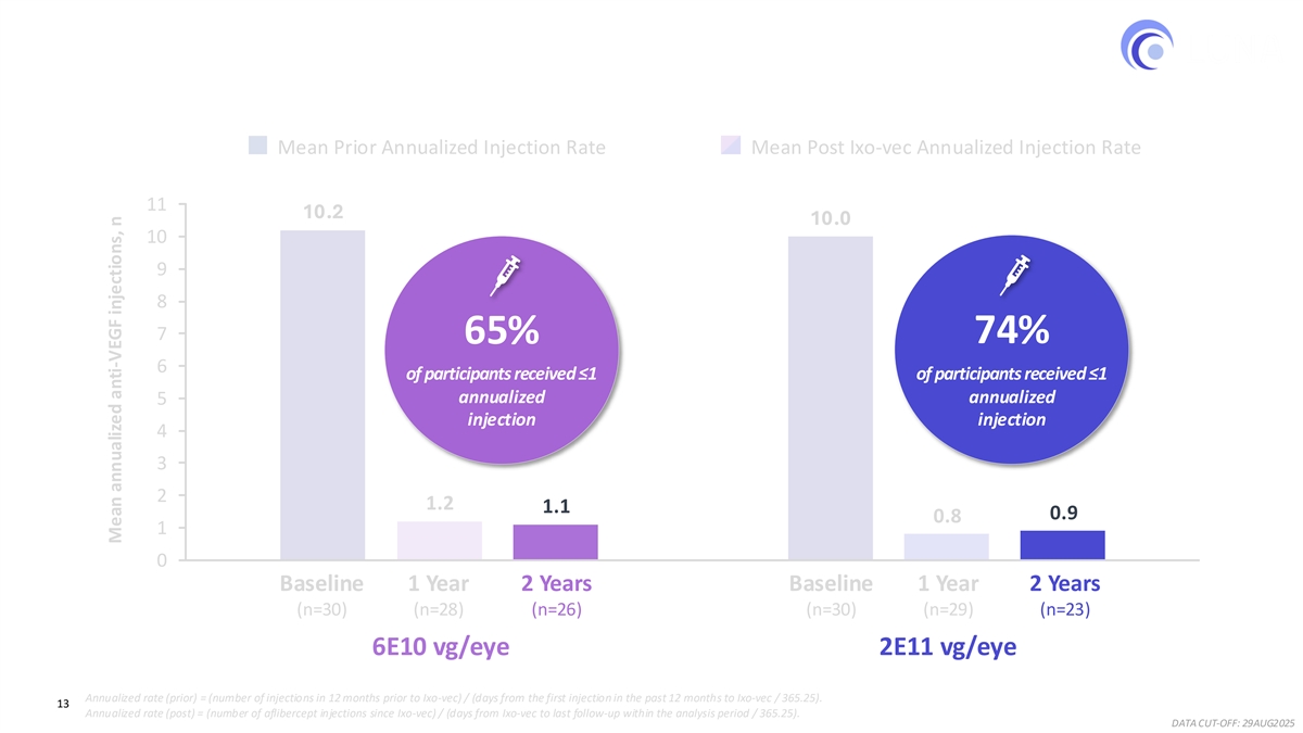 Robust and Consistent Reduction in Injection Burden Through Year 2 ~90% reduction in mean annualized anti-VEGF injections in a high need population Mean Prior Annualized Injection Rate Mean Post Ixo-vec Annualized Injection Rate 11 10.2 10.0 10 9 8 7 –89%–89% –92%–90% 6 5 4 3 2 1.2 1.1 0.9 0.8 1 0 1 2 Baseline 1 Year 2 Years Baseline 1 Year 2 Years (n=30) (n=28) (n=26) (n=30) (n=29) (n=23) 6E10 vg/eye 2E11 vg/eye Annualized rate (prior) = (number of injections in 12 months prior to Ixo-vec) / (days from the first injection in the past 12 months to Ixo-vec / 365.25). 12 Annualized rate (post) = (number of aflibercept injections since Ixo-vec) / (days from Ixo-vec to last follow-up within the analysis period / 365.25). DATA CUT-OFF: 29AUG2025 Mean annualized anti-VEGF injections, n