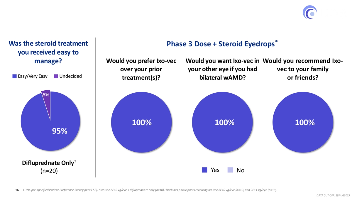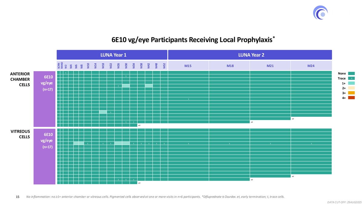 LUNA 2-year Safety Results Ixo-vec Phase 3 dose well tolerated, no new inflammation observed in year 2 * 6E10 vg/eye Participants Receiving Local Prophylaxis LUNA Year 1 LUNA Year 2 M15 M18 M21 M24 0 0 t 0 0 0 0 0 0 0 0 0 0 0 0 0 0 0 0 0 0 None ANTERIOR 0 0 0 0 0 0 0 0 0 0 0 t 0 0 0 0 0 0 0 0 0 6E10 t Trace 0 0 0 0 0 0 0 0 0 0 0 0 0 0 0 0 0 0 0 0 CHAMBER 0 0 0 0 0 0 0 0 0 0 0 0 0 0 0 0 0 0 0 0 0 vg/eye 1+ CELLS 0 0 0 0 0 0 0 0 0 0 t 1+ 0 0 1+ 0 0 0 0 0 0 2+ 0 0 0 0 0 0 0 0 0 0 0 (n=17) 0 0 0 0 0 0 0 0 0 0 0 0 0 0 0 0 0 0 0 0 0 3+ 0 0 0 0 0 0 0 0 0 0 0 0 0 0 0 0 0 0 0 0 0 4+ 0 0 0 0 0 0 0 0 0 0 0 0 0 t 0 0 0 0 0 0 0 0 0 0 0 0 0 0 0 0 0 0 0 0 0 0 0 0 0 0 0 0 0 0 0 0 0 0 0 0 0 0 0 0 0 0 0 0 0 0 0 0 0 0 0 0 0 0 0 0 0 0 0 1+ t 0 0 0 0 0 0 0 0 0 0 0 0 0 0 0 0 0 0 0 0 0 0 0 0 0 0 0 0 0 0 0 0 0 0 0 0 0 0 0 0 0 0 0 0 0 0 0 0 et 0 0 0 0 0 0 0 0 0 0 0 t t 0 0 0 0 0 0 et 0 0 0 0 0 0 0 0 0 0 0 0 0 et 0 0 0 0 0 0 0 0 0 0 0 0 0 0 0 0 0 0 0 0 0 VITREOUS 0 0 0 0 0 0 0 0 0 0 0 0 0 0 0 0 0 0 0 0 0 6E10 0 0 0 0 0 0 0 0 0 0 0 0 0 0 0 0 0 0 0 0 0 CELLS 0 0 0 0 0 0 0 0 0 0 0 0 0 0 0 0 0 0 0 0 0 vg/eye 0 0 0 0 1+ 1+ t 0 t t 1+ 1+ t t t t t t t t t 0 0 0 0 0 0 0 0 0 0 0 0 0 0 0 0 0 0 0 0 0 (n=17) 0 0 0 0 0 0 0 0 0 0 0 0 0 0 0 0 0 0 0 0 0 0 0 0 0 0 0 0 0 0 0 0 0 0 0 0 0 0 0 0 0 0 0 0 0 0 0 0 0 0 0 0 0 0 0 0 0 0 0 0 0 0 0 0 0 0 0 0 0 0 0 0 0 0 0 0 0 0 0 0 0 0 0 0 0 0 0 0 0 0 0 0 0 0 0 0 0 0 0 0 0 0 0 0 0 0 0 0 0 0 0 0 0 0 0 0 0 0 0 0 0 0 0 0 0 0 0 0 0 0 0 0 0 0 0 0 0 0 0 0 0 0 0 0 0 0 0 0 0 0 0 0 0 0 0 0 0 0 0 0 0 0 0 0 0 0 0 0 0 0 0 0 0 0 0 0 0 0 0 0 0 0 0 et 0 0 0 0 0 0 0 0 0 0 t t t 0 0 0 0 0 0 et 0 0 0 0 0 0 0 0 0 0 0 0 0 et 15 No inflammation: no ≥1+ anterior chamber or vitreous cells. Pigmented cells observed at one or more visits in n=6 participants. *Difluprednate ± Ozurdex. et, early termination; t, trace cells. DATA CUT-OFF: 29AUG2025 SCRN RAND W2 W4 W6 W8 W10 W14 W18 W22 W26 W30 W34 W38 W42 W48 W52